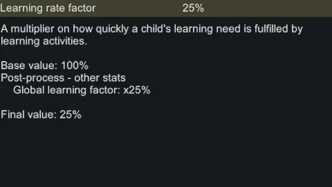 Makes Biotech's "Learning Rate Factor" stat be affected by the "Global Learning Factor" stat if it isn't already. That is all. Technically, Biotech isn't required, but without it this mod does nothing.