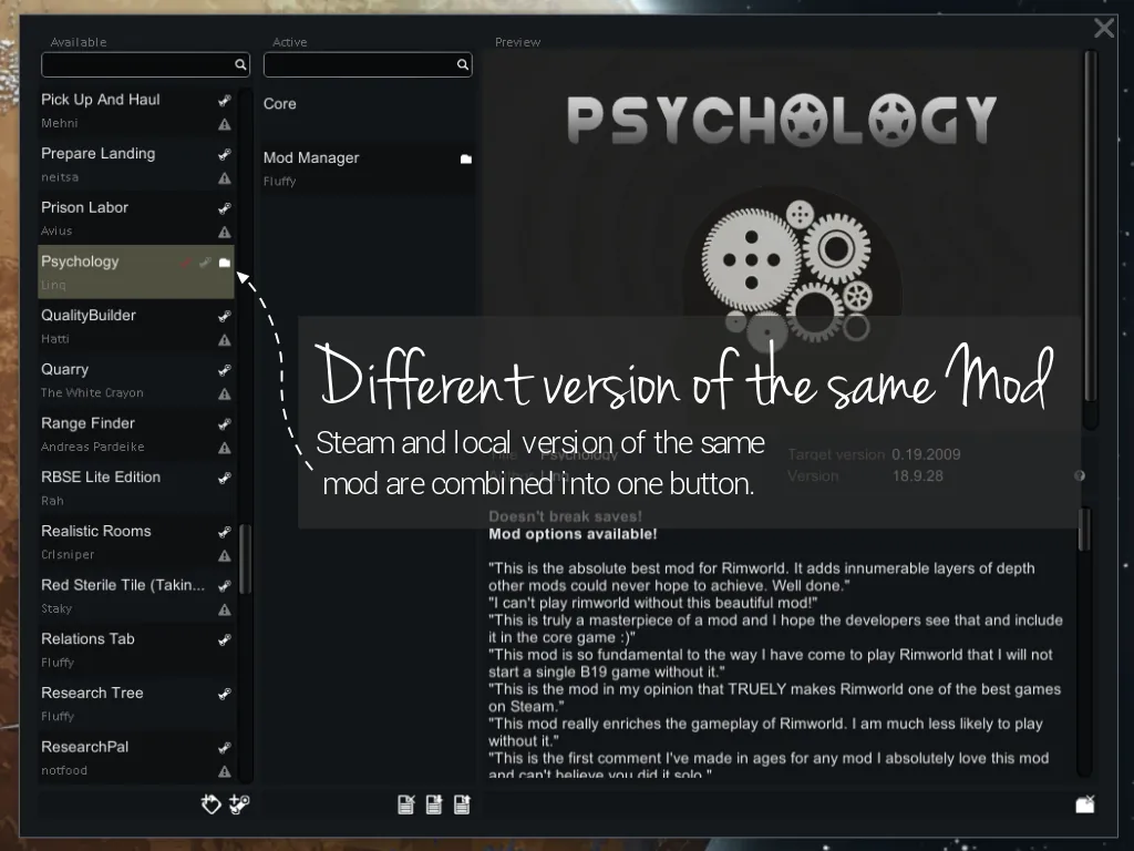 [i]Note: You may want to occasionally delete obsolete local copies, as having many mods in the mod folder will make RimWorld take longer to start, and the Mod Manager window take longer to open.[/i]