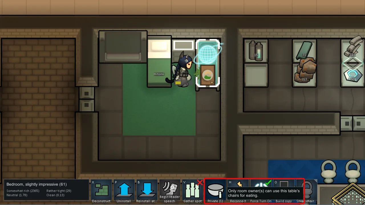 [*] Additional, when set to Private, you can assign a specific colonist or slave to the chair. No one else will be allowed to use it.