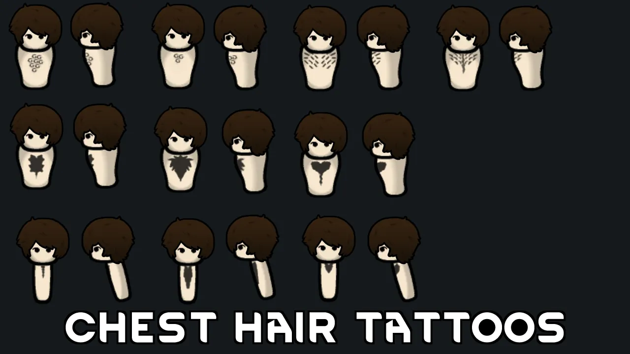 Adds tattoos drawn to look like chest hair. You can easily set the colony tattoo's policy to be male only on this set of tattoos in the Ideology settings.