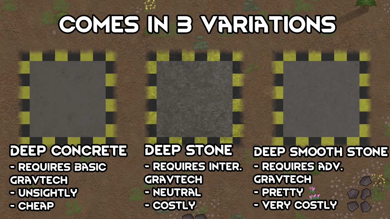 This is a simple mod that adds terrain-altering concrete floors that don't disappear when your Gravship lands on them.
