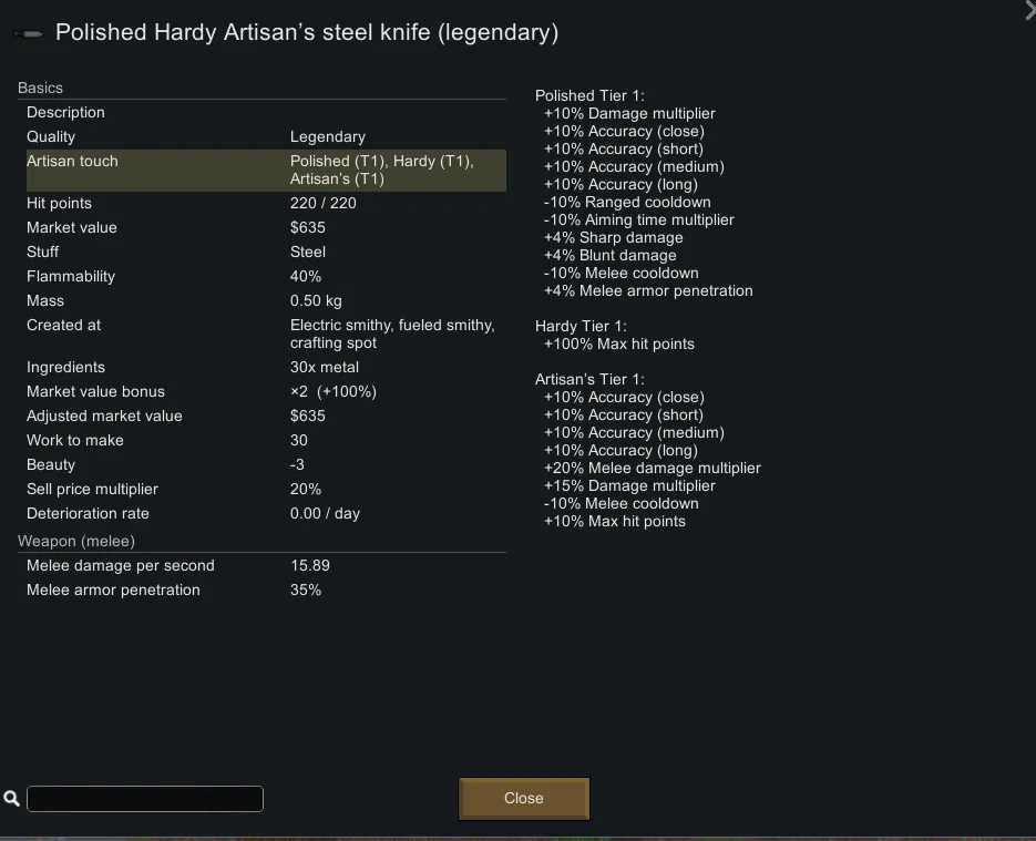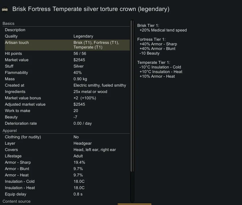 Instead, it focuses on pure stat modifiers, inspired by Terraria’s prefix system, but tied directly to colonist Crafting skill and item quality.