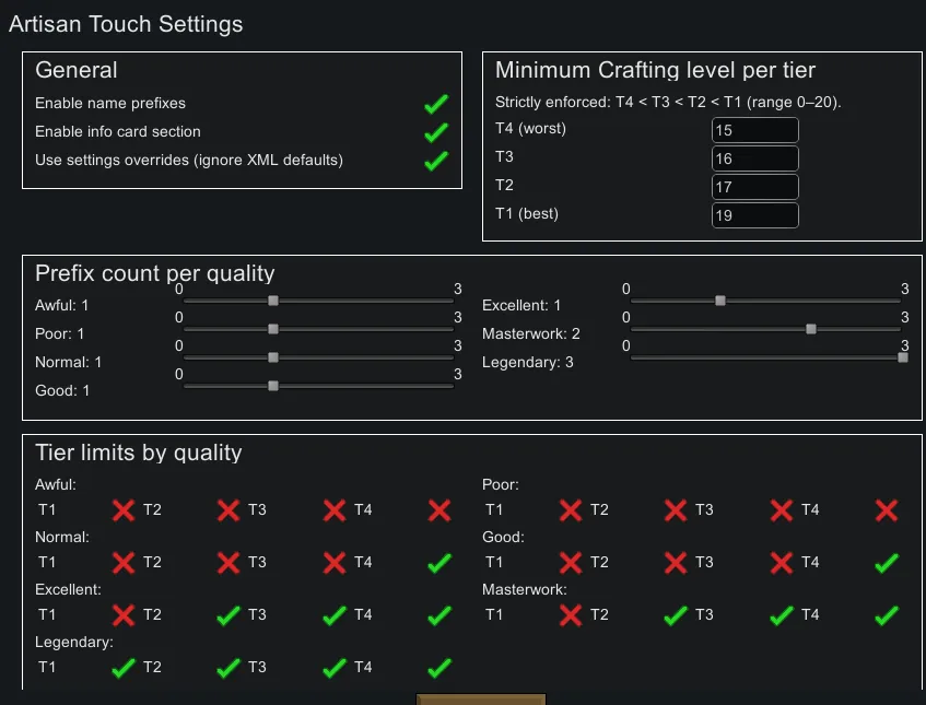 Yes. The settings menu lets you toggle individual prefixes, control counts by quality, and set tier rules (Tier spawning for quality, ammount of prefix per quality, Tier access by pawn skill level).