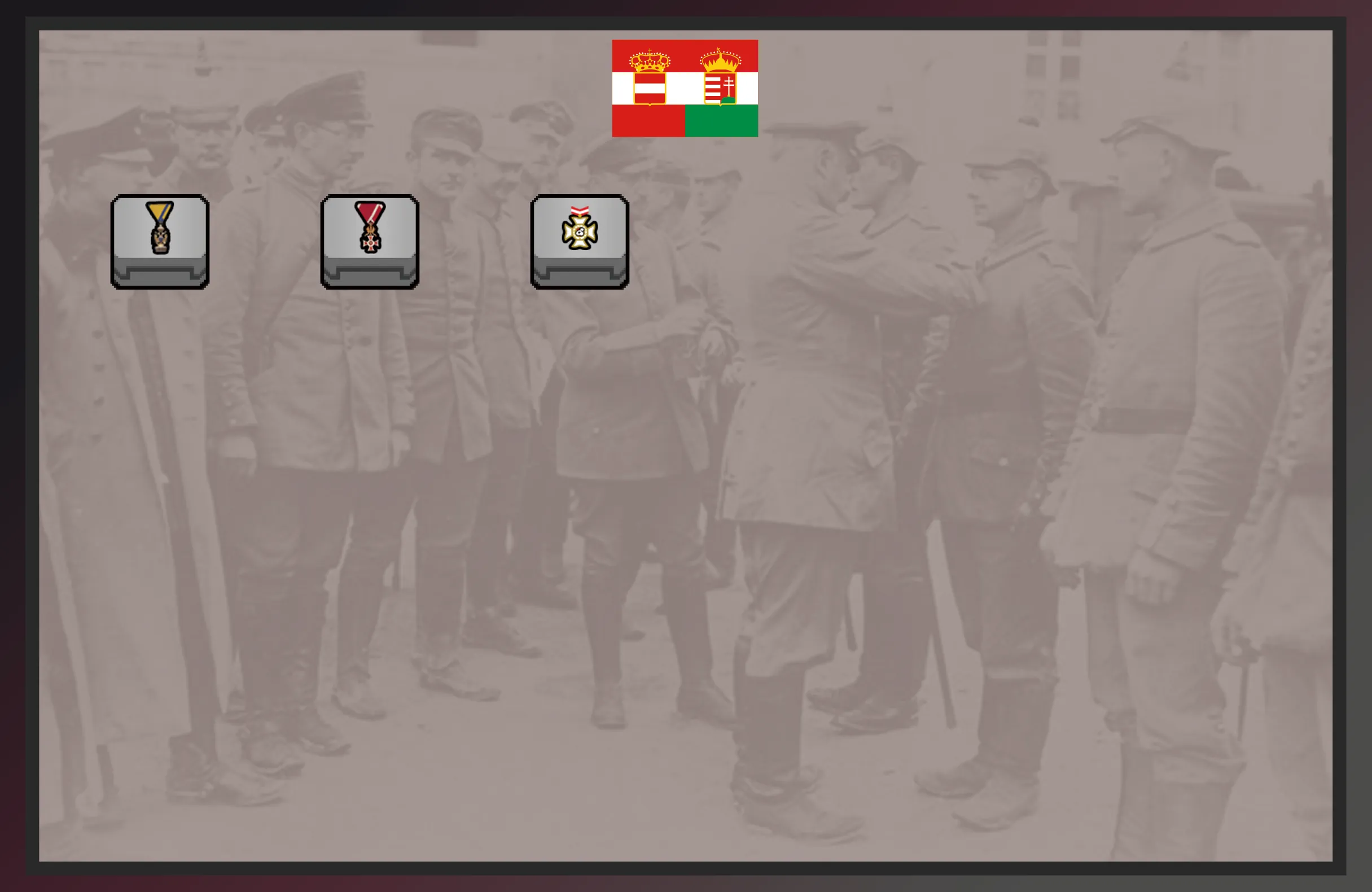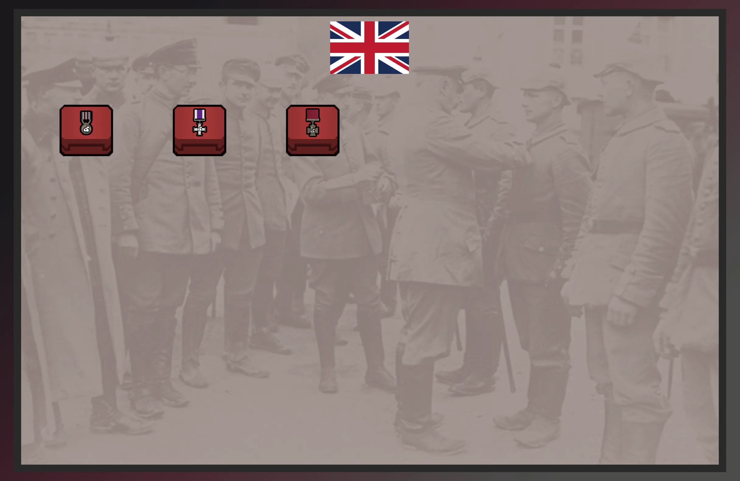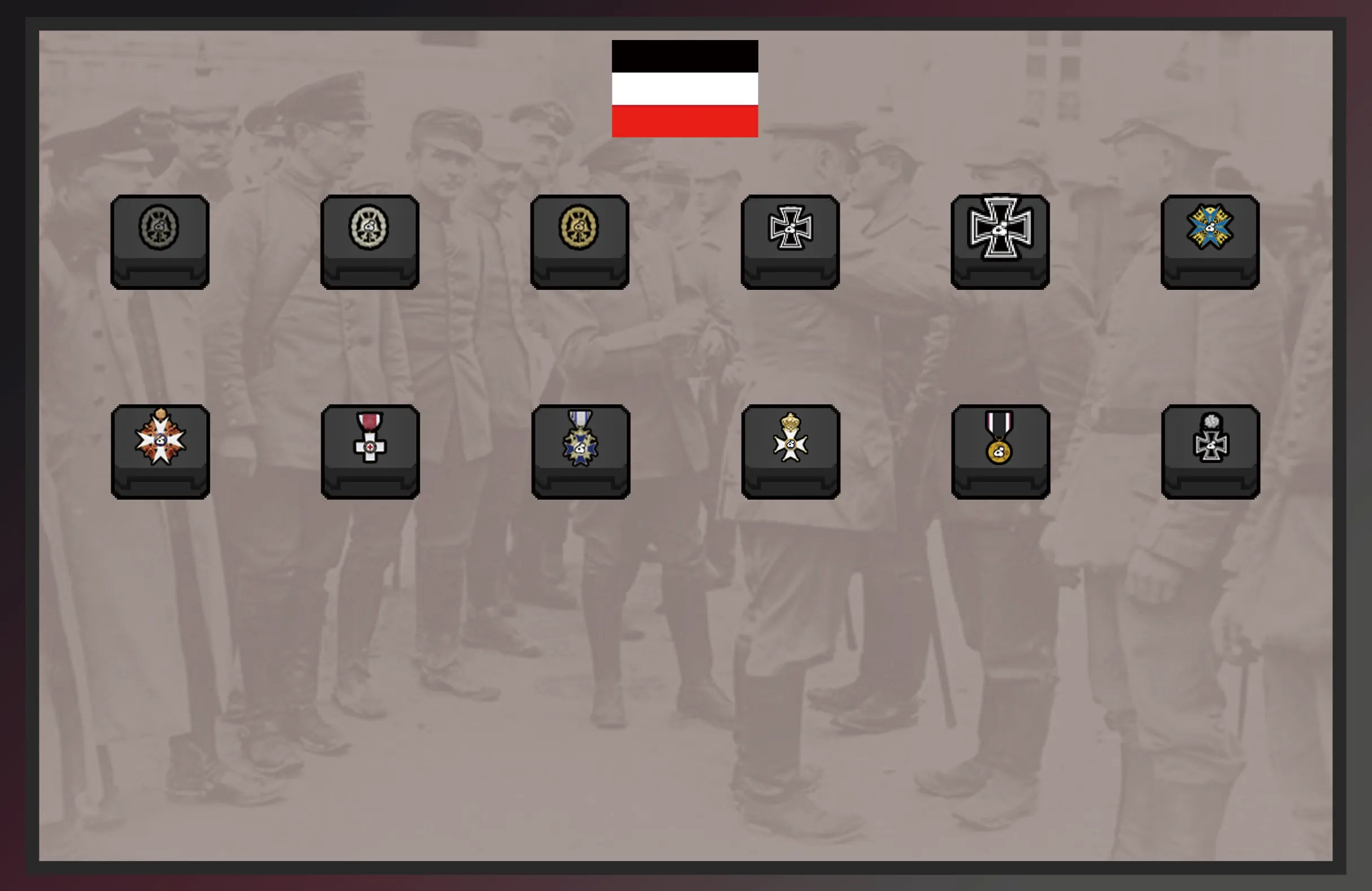The nations borrow names from their mod, and the medals are based on real WWI-era medals. Some descriptions or actual effects have been adjusted for gameplay purposes.
