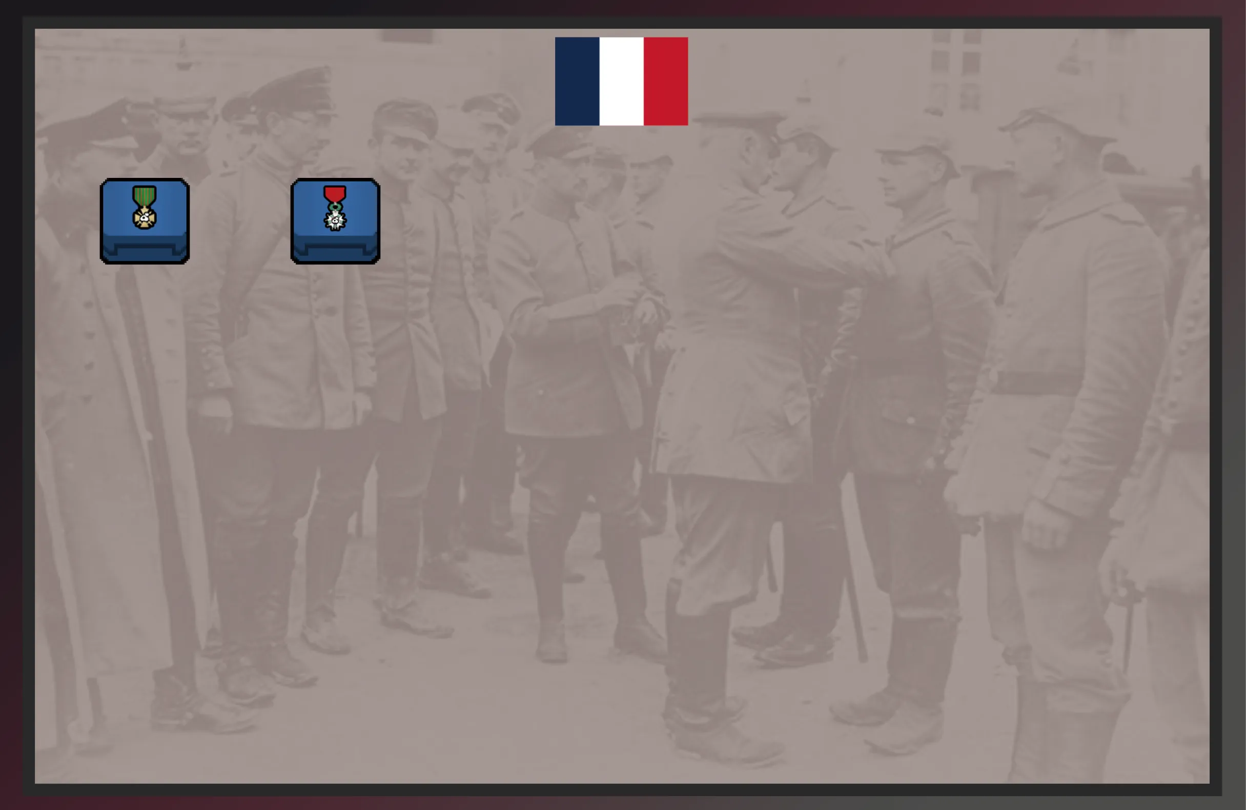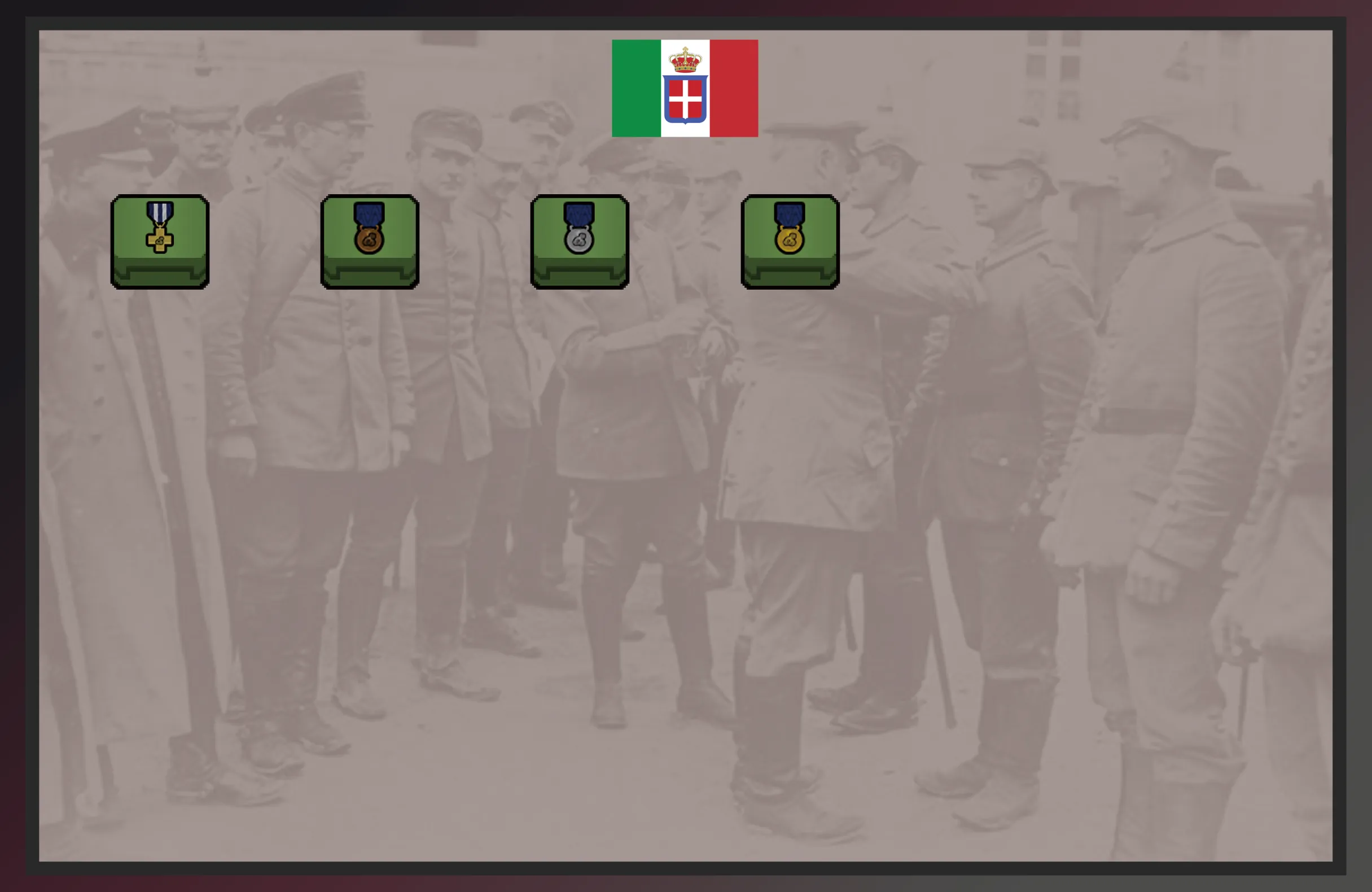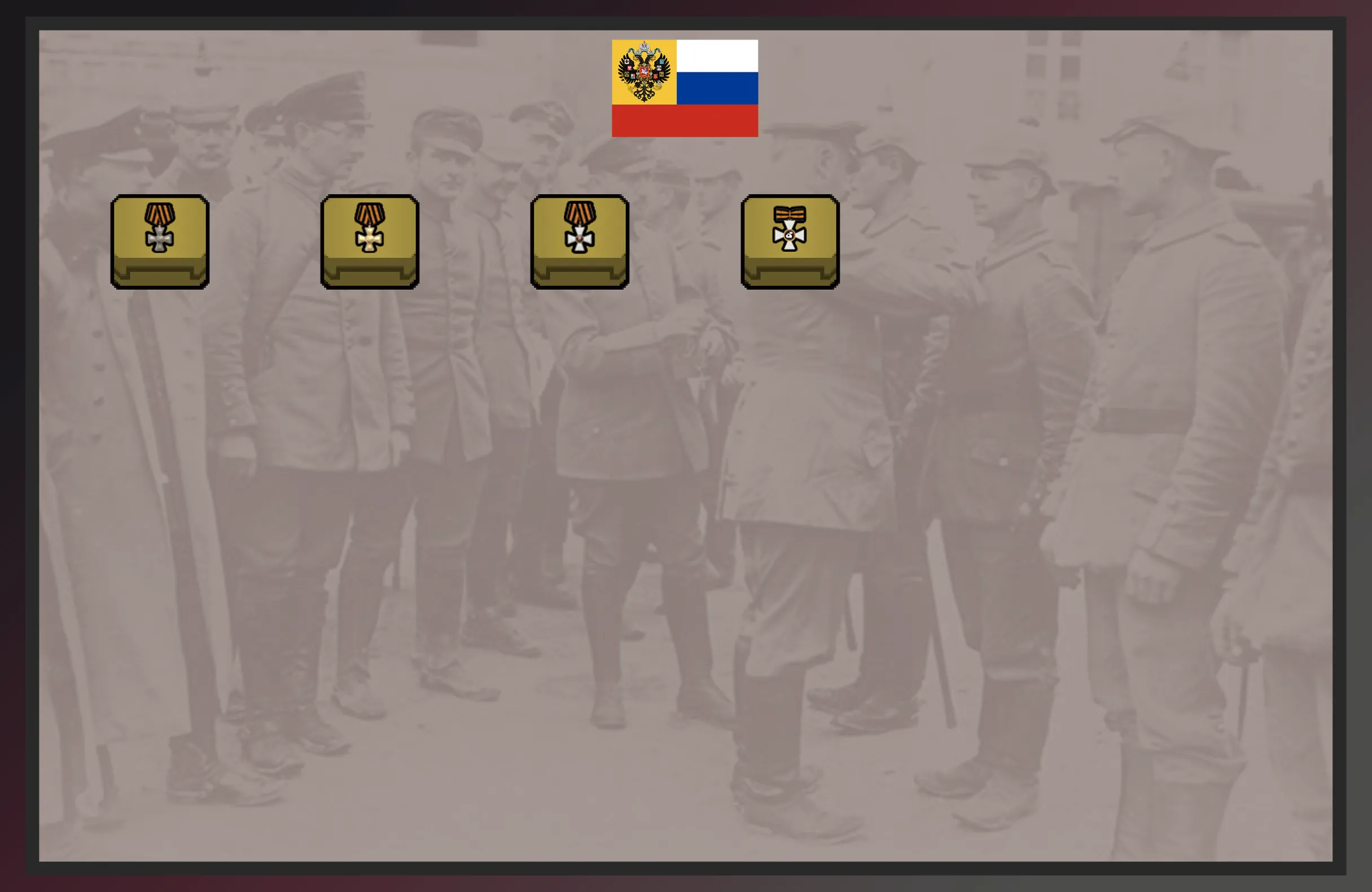The nations borrow names from their mod, and the medals are based on real WWI-era medals. Some descriptions or actual effects have been adjusted for gameplay purposes.
