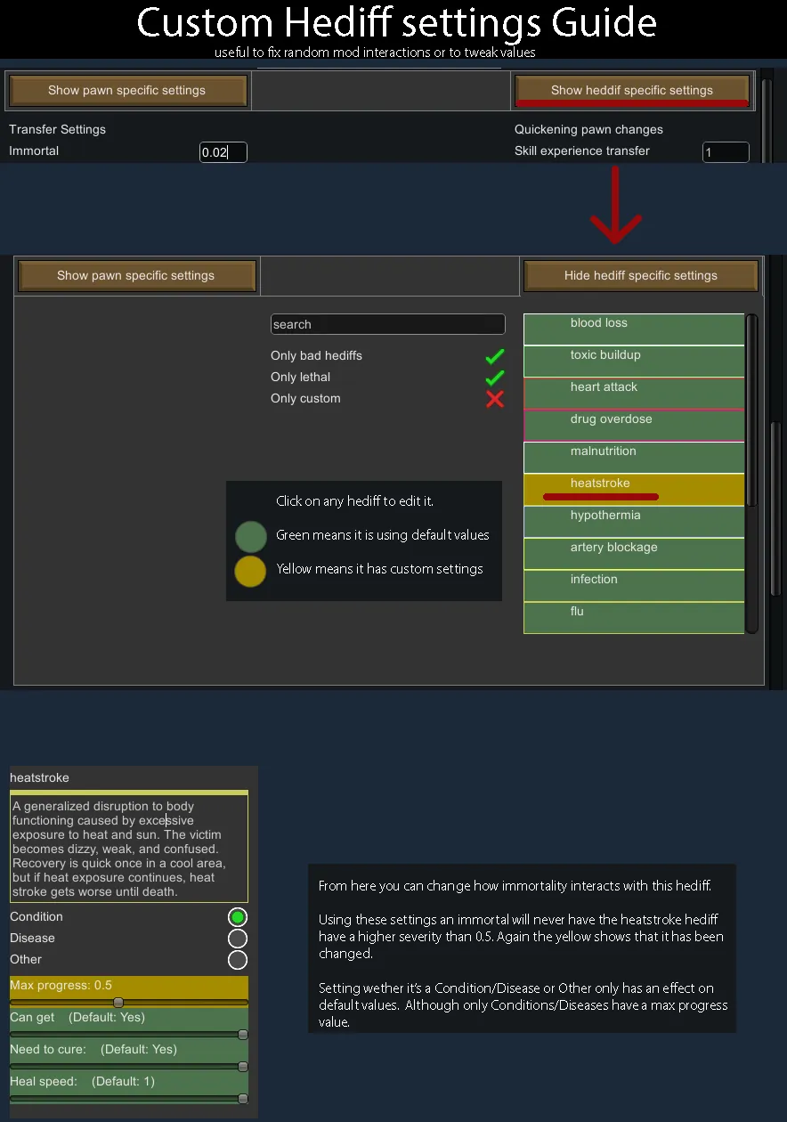 [*] Each time the immortal condition ticks it will pick a random injury to heal. This takes into account the pawn's size and their immortality and the heal speed setting. This effect will also tick limbs that need regeneration so more injuries will slow down the rate at which they recover. The hunger is only ticked everytime a limb regrowth is ticked so this won't cause it to cost more hunger. How an immortal responds to each hediff can be changed in the settings. Limb regrowths are only checked on rare ticks and prosthetic organs and limbs are all safe.