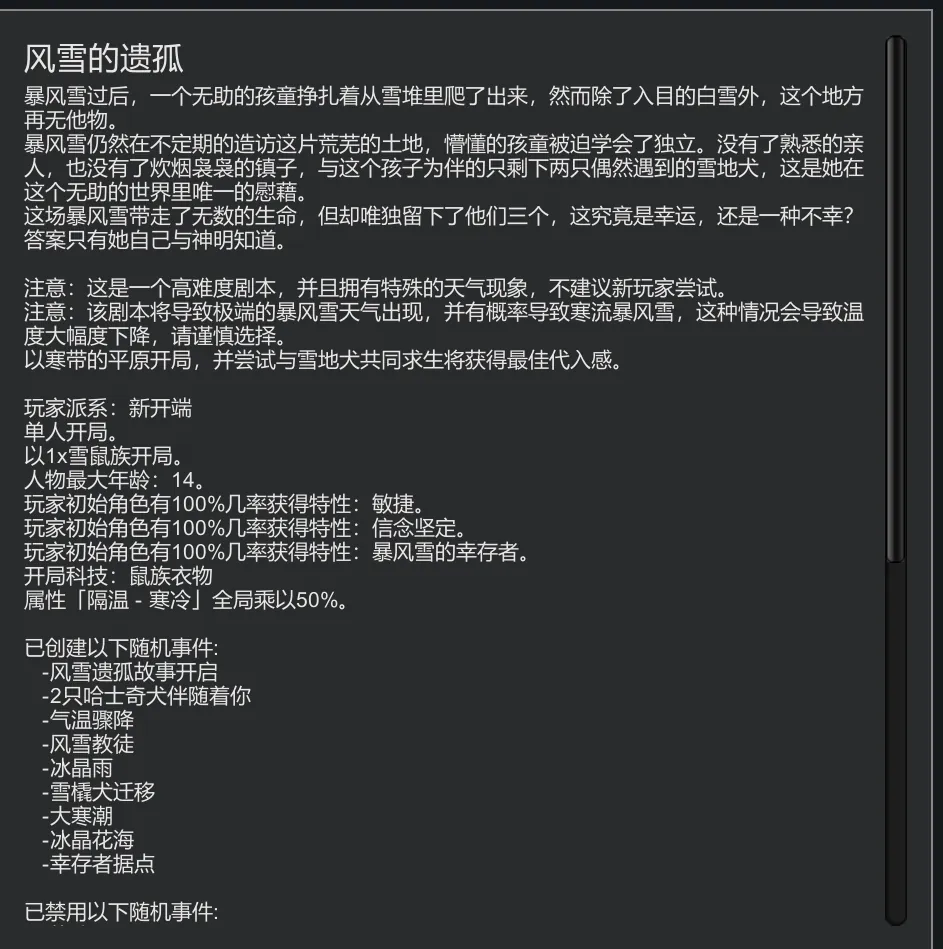 Due to the fact that this mod is a script extension, it has inherent limitations in terms of basic volume. In addition, I discovered during production that I may not be suitable for the production of storyline mods, so the actual gaming experience may not meet your expectations. If you can slightly lower your expectations, perhaps the orphaned children of the snowstorm will give you a more satisfying experience. Suggested travel expectations: low to high.
