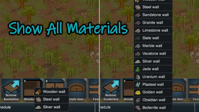 Adds a hotkey (default shift) that when held makes all materials visible for buildings and furniture, not just those on the map.