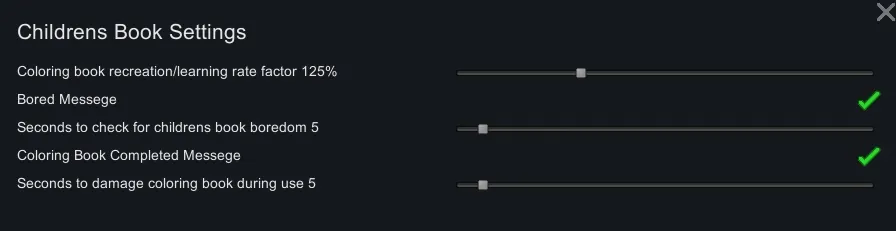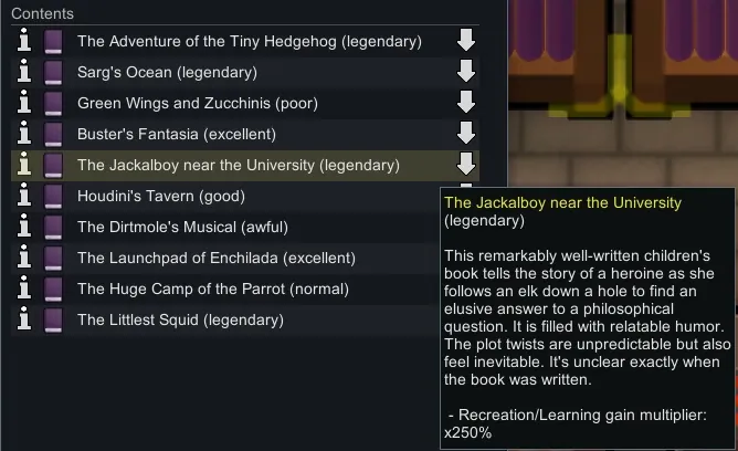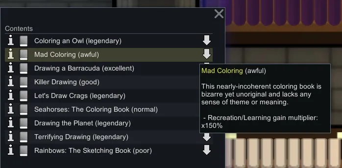 Adds coloring books with vanilla, and children's books with Biotech. While reading them LearningRateFactor is increased with Biotech installed. Children's books can only be read at length by children, teens and adults will quickly become bored trying to read them, but pawns can read them to babies. On top of that teens and adults can now read them to children as bed time stories, and pawns can make art of themselves reading to babies and children. Coloring books can be read by anyone and have higher recreation and learning rates vs novels or children's books, but reading them will lower their hit points until they are "fully colored in" and become trash. Any trader that sells novels should also sell 0-1 of each of these books. Check the settings, I added several.