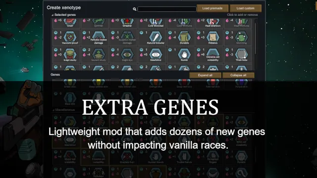 Extra Genes is a mod that adds dozens of new genes allowing for more variety and min-maxing of your pawns. It is a very lightweight mod that does not change any core mechanics or races. It can be safely added to existing saves.