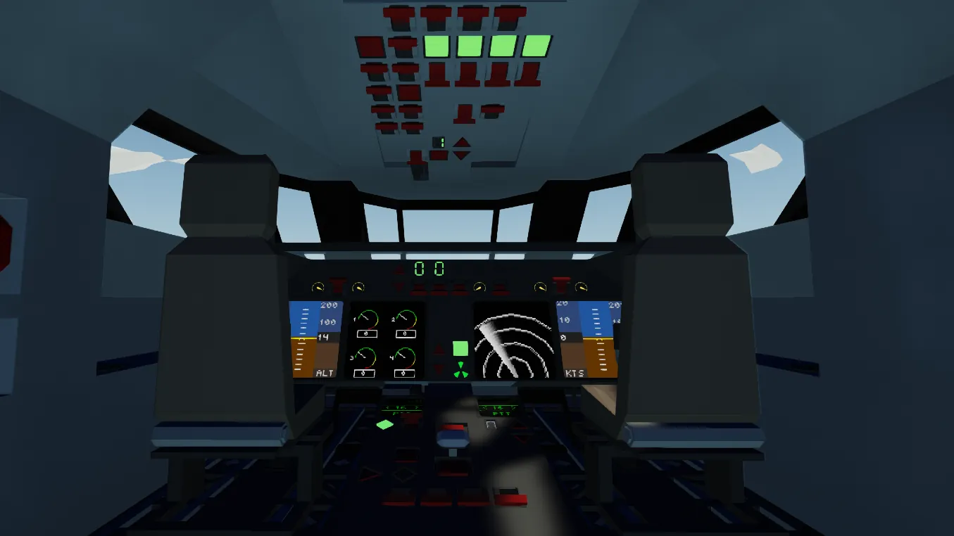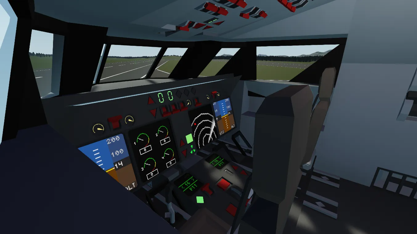 Simple and intuitive cockpit layout with four clean displays showing the horizon, medium‑range radar, and engine temperature. The fly‑by‑wire system includes altitude hold, stabilizer control, auto‑throttle, and heading hold.