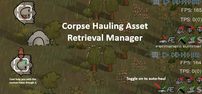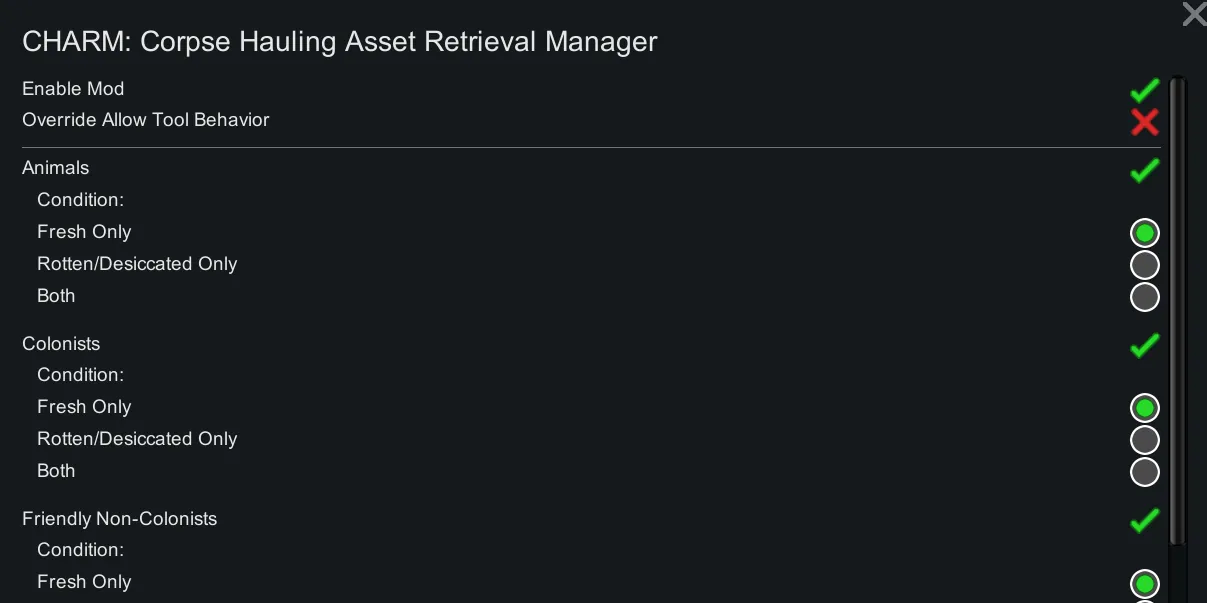 Checks if you are running [url=https://steamcommunity.com/sharedfiles/filedetails/?id=3524716849]Keyz' Allow Utilities[/url] or [url=https://steamcommunity.com/sharedfiles/filedetails/?id=761421485]Allow Tool[/url] and marks corpses with the appropriate urgent haul designator. If you are running neither it allows the corpse.