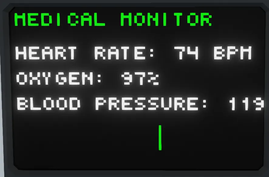 Only displays info if there is a player or NPC on the medical bed (Intended use is medical bed, but feel free to use anything). - NOT tested on NPCs yet, but i'm positive it will work.