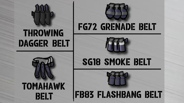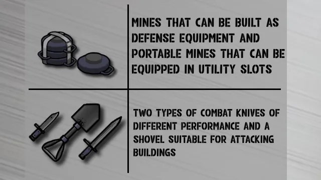 通常の武器のほかに、グレネードランチャーが搭載された武器や、武器と併用してナイフや手榴弾を投擲できるベルト、小型IEDとして機能する地雷や、それらを携帯するためのユーティリティ装備を追加します。