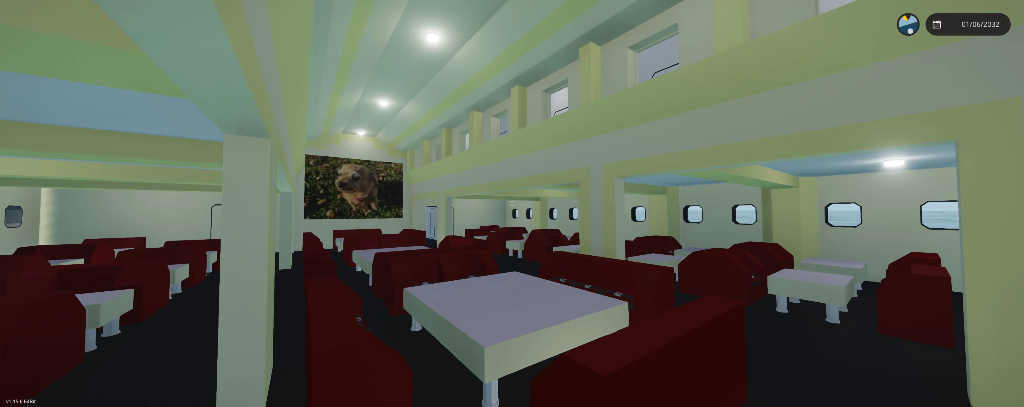 Image sources: Most of the pictures throughout the ship came from Wikipedia, except for the large image of the SS United States in the lounge, which came from the wonderful Steve Walker collection, and the picture of the dog in the main dining room, which is my amazing Mitzy!