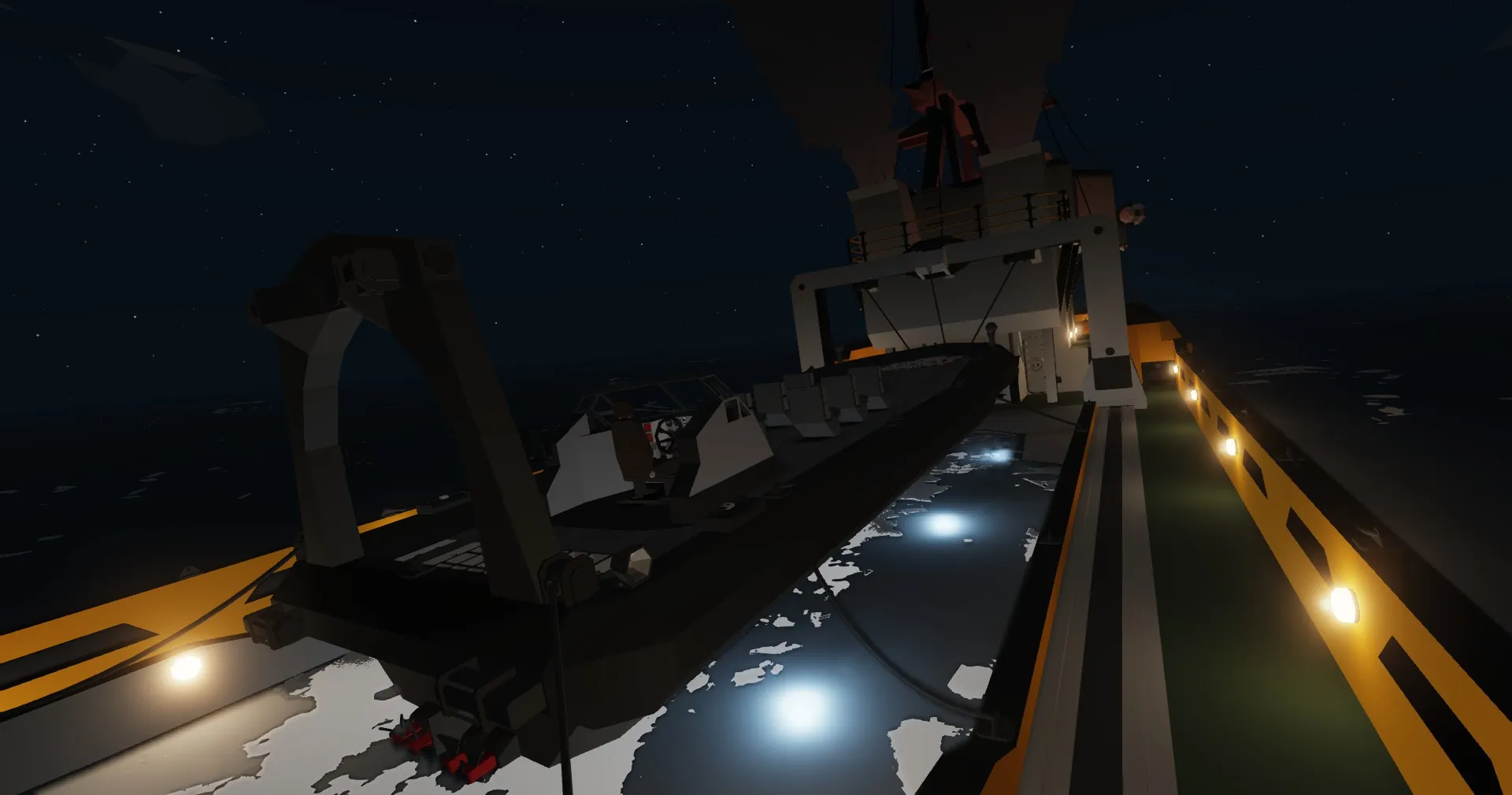 In the stern you'll find a large tow area, large enough to land helicopters and tow small-medium sized boats. You'll also find a crane and a huge winch if you wanna retrieve something from the seafloor. You also find winches for refueling on each side (port & starboard).