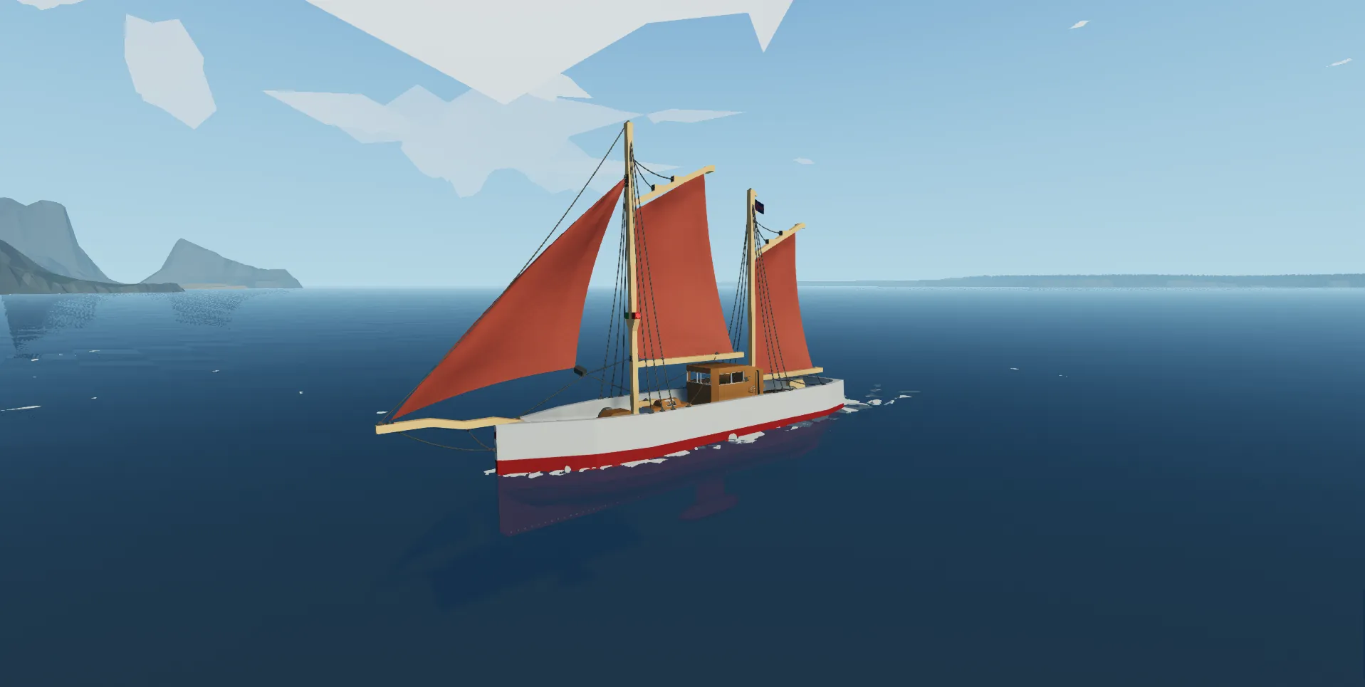 A simple sloop with two main sails one forward sail and a electrical motor to help with maneuvering loosely based on the Thorshavn