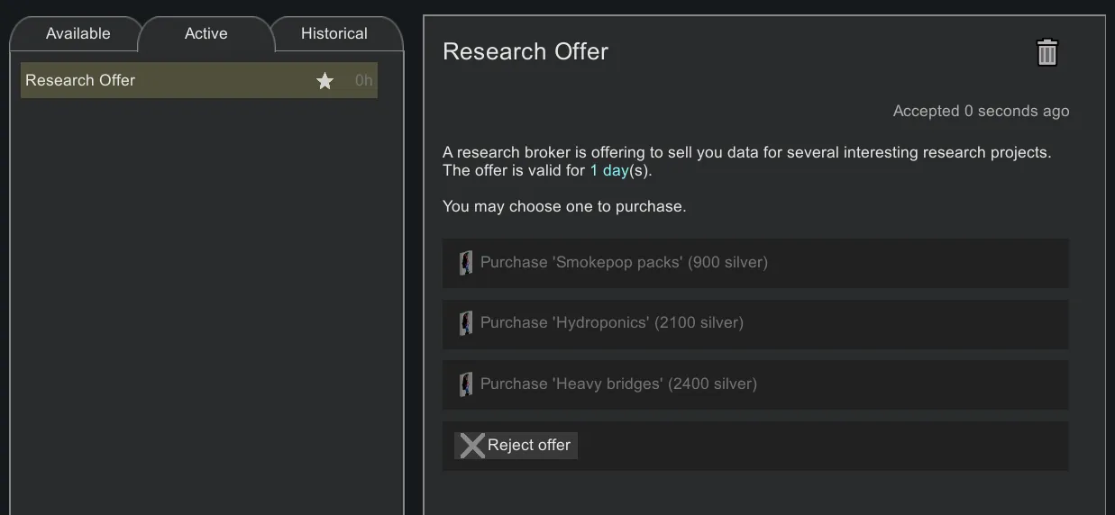 A research broker event will occasionally appear, offering research data in exchange for silver.