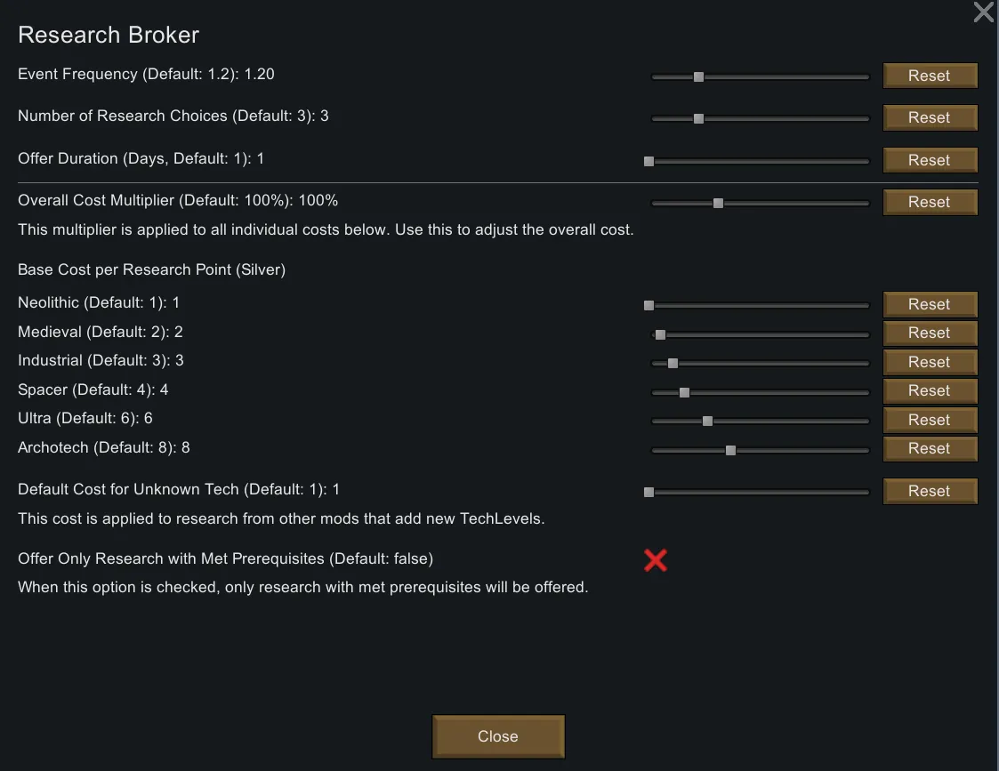 * The cost per research point and the number of options offered can be directly changed through the mod settings.