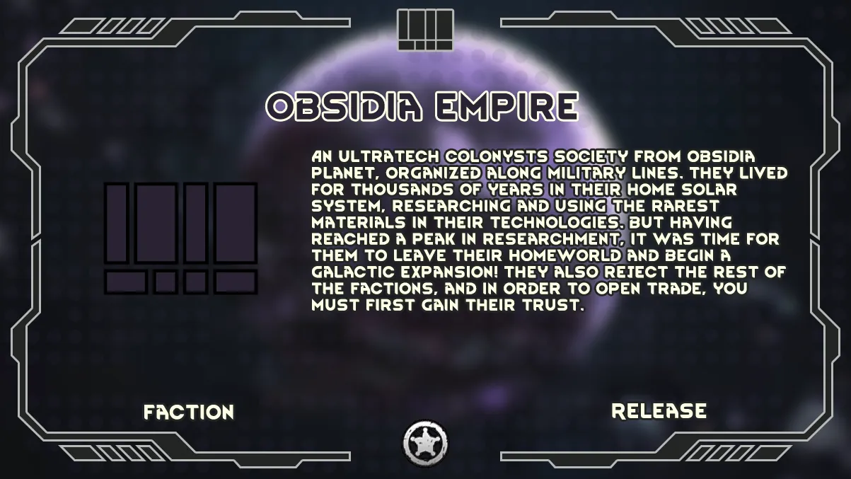 The core of the mod is the [b]Obsidia Empire[/b] - an ultratech military society at the peak of its research, seeking galactic expansion while rejecting all others until their trust is earned.