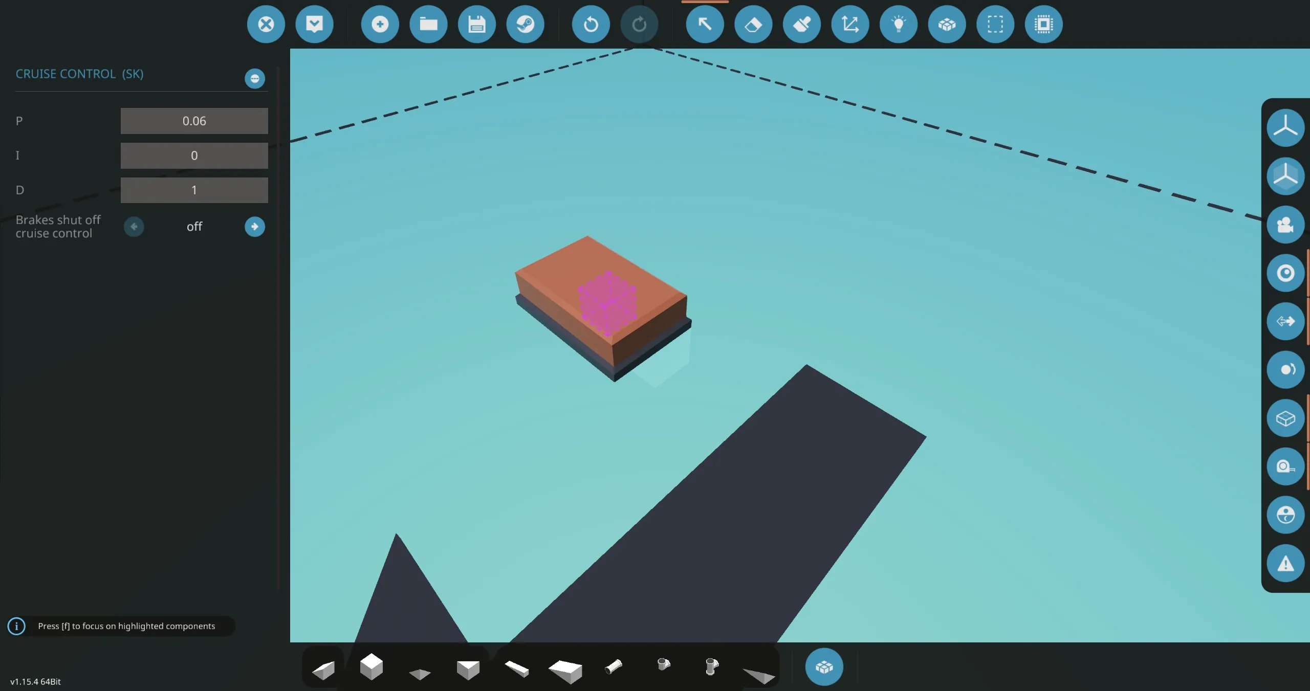 [*] To adjust it, there are the P, I, and D values that you can mess with, But this should not be needed. You also have an option if you want the brakes to shut off the cruise control or not, like in a real car.