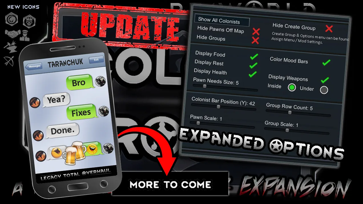 [b] Compatible[/b] with [url=https://steamcommunity.com/sharedfiles/filedetails/?id=2526040241] Pawn Badge[/url], [url=https://steamcommunity.com/sharedfiles/filedetails/?id=2086300611] Job in Bar[/url], and [url=https://steamcommunity.com/sharedfiles/filedetails/?id=2006605356] Color Coded Mood Bar[/url] (CCMB is still a BETA compatibility patch, meaning some features from CG may not work)