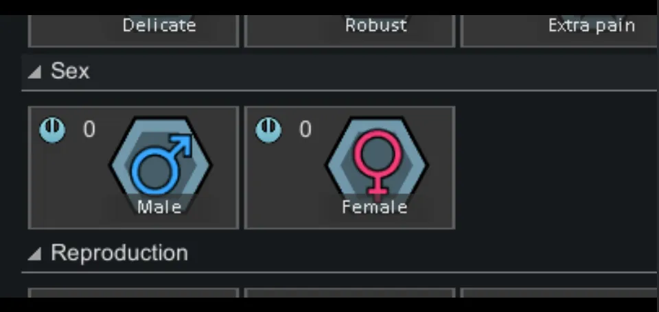 Adds two new genes, Male and Female. Pawns with these genes may only be the corresponding sex. Implanting these genes into an existing pawn will change their sex.