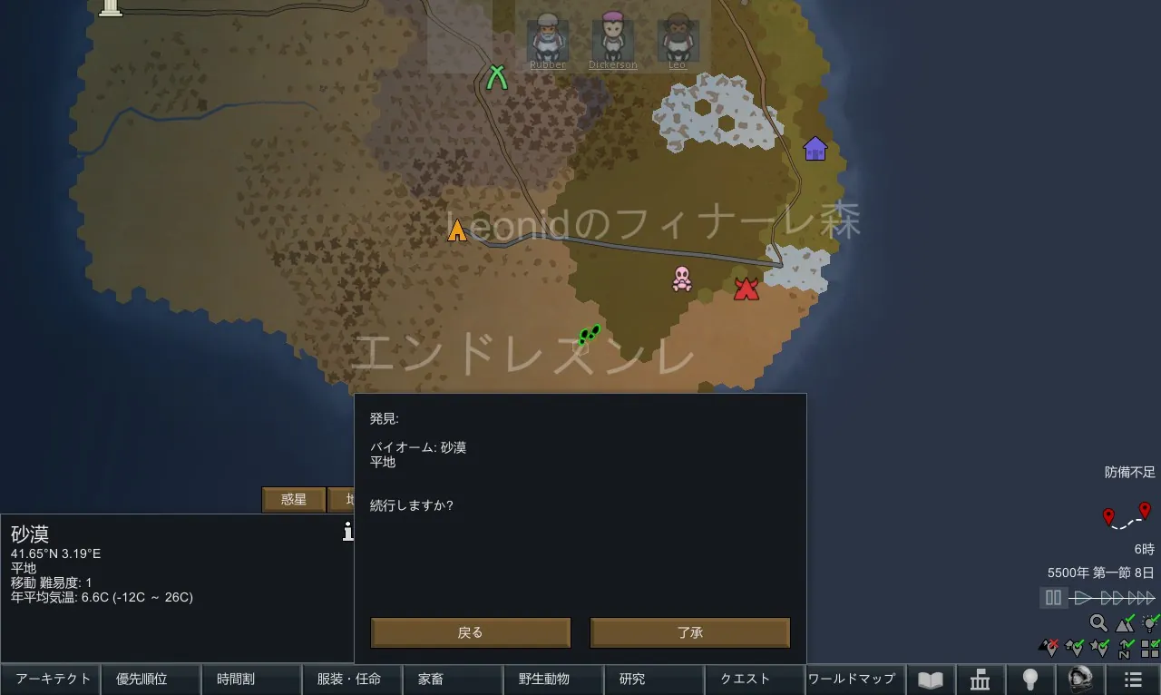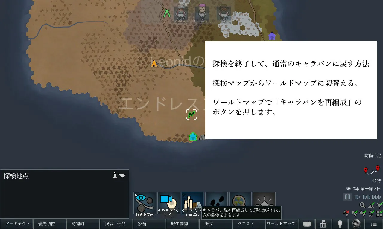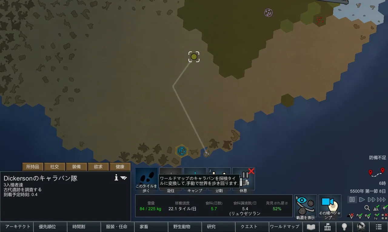 入植者をワールドマップのタイルを手動で歩かせて、Rimworldの惑星を探検しましょう。各タイルの端から端まで移動して,拠点を訪れたり、クエストを受けましょう。世界中を歩き回るのです!