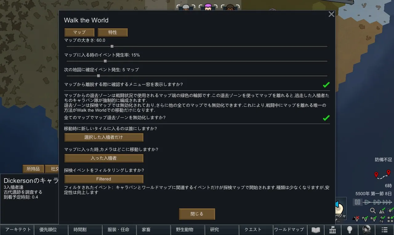多くの機能はカスタマイズ可能です:探検マップのサイズ、ランダムイベント発生率、旅行中の入植者やカメラの挙動などを変更できます。