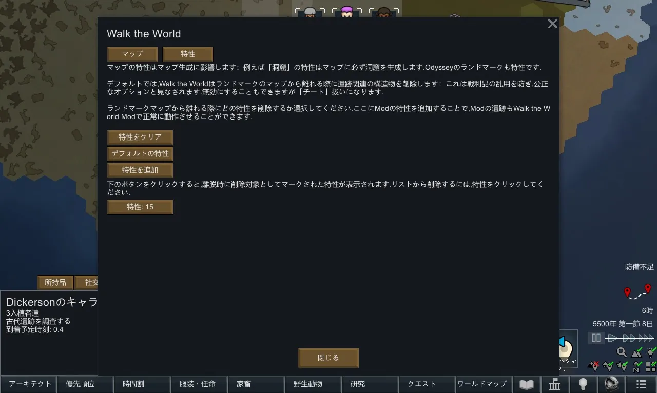 Walk The Worldは細かい管理をModの中核にしています。探検隊と稼働中のコロニーの両方を維持することは技術的には可能ですが、遊牧スタイルでのプレイを強く推奨します。