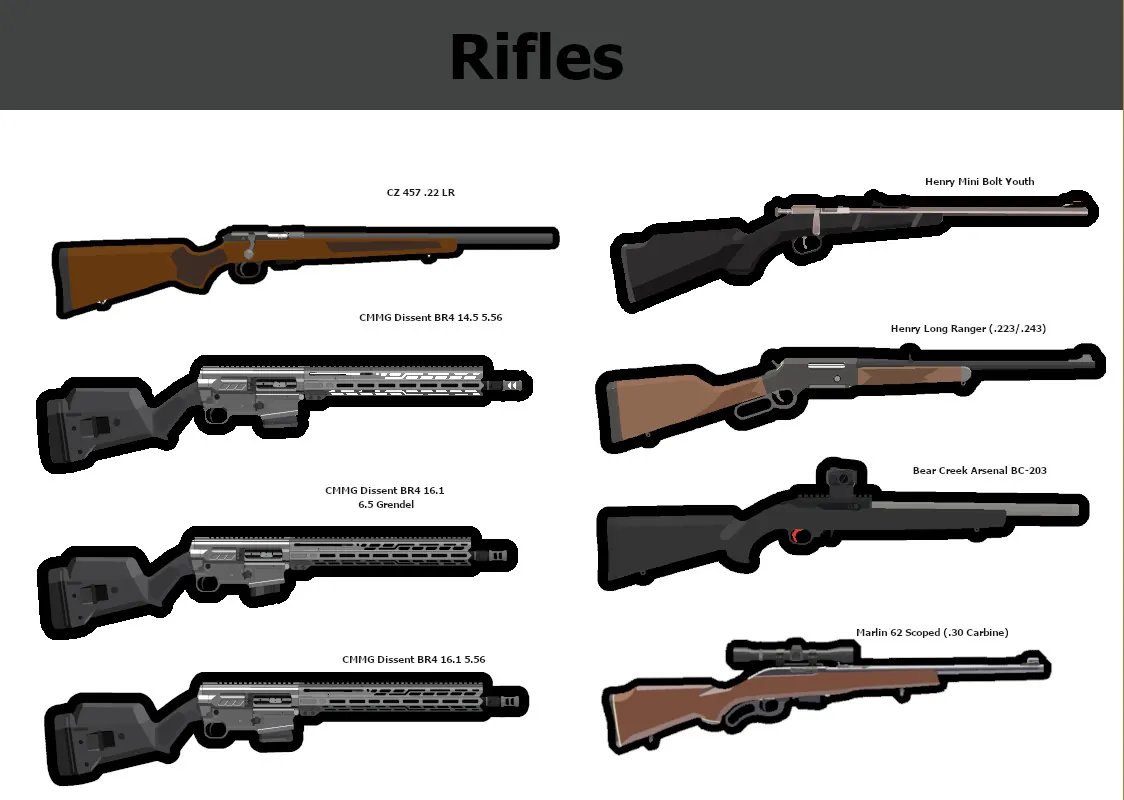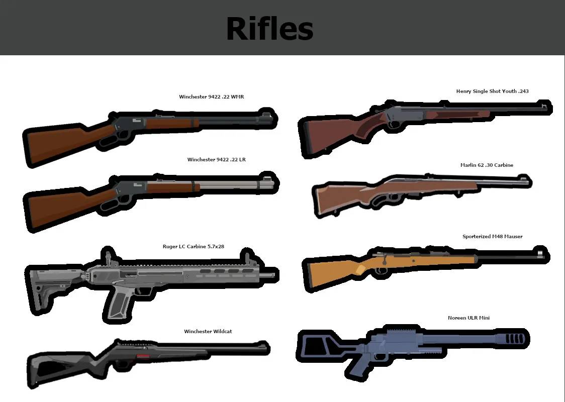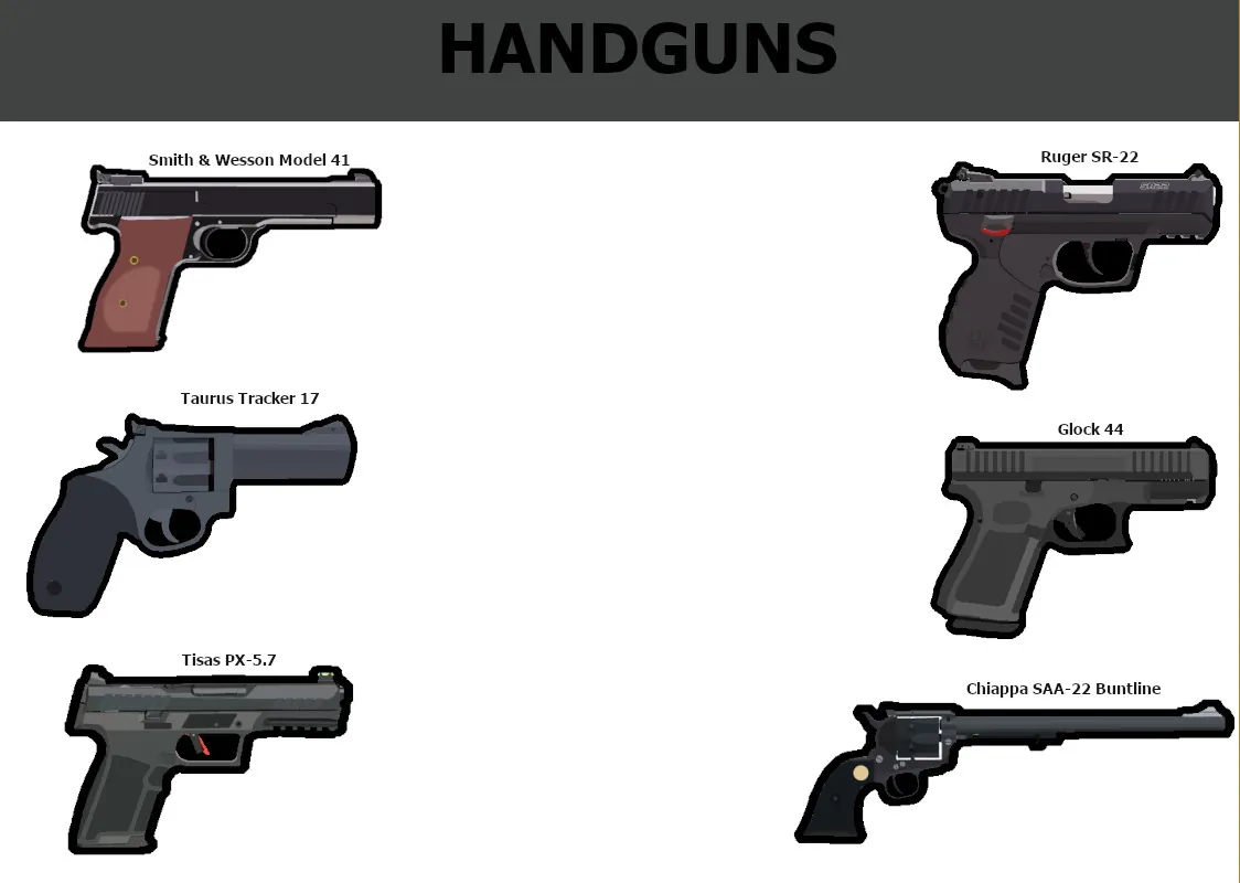 Currently there are 10 firearms, with more drawn and ready for code. Included are: