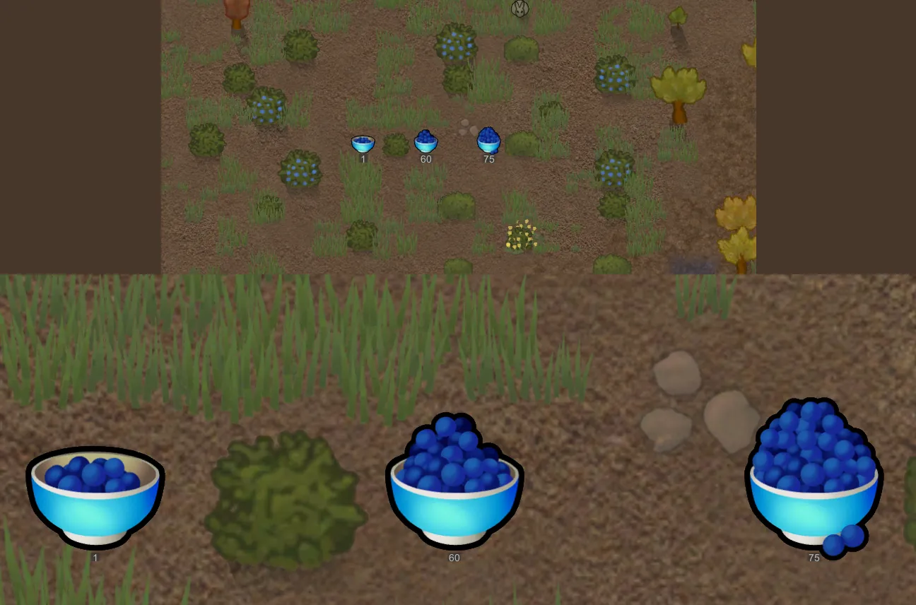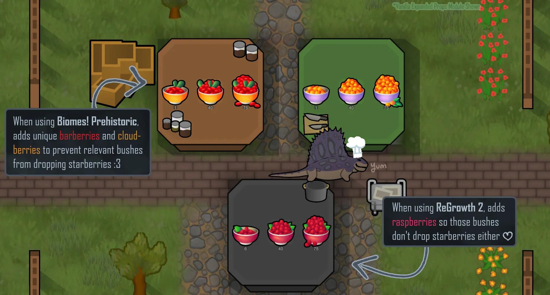 The berry texture vexes me greatly. I do not like the color and I do not like the yellow-orange, L-shaped boxes RimWorld puts produce in (I [i]know[/i] it's technically two rectangular boxes right next to each other, but let's be honest. It looks like an L). Let us be rid of it! >:p