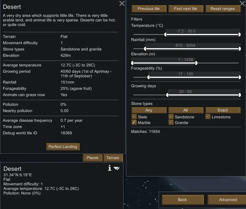 Fine-tune your RimWorld start with fast, zero-fluff filters in the Terrain tab. Pick your climate, geology, and growing season, then jump between matching tiles in one click.