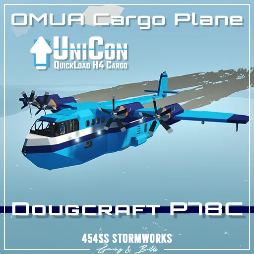 Built by (fictional) Dougcraft Avionics since 1951, the P78 has served as a reliable transport plane for delivery services world wide. The P78C is the cargo variant, with a large bay for various type of cargo. The cargo bay is outfitted for various types of cargo, featuring 3 UniCon/H4 slots or 1.5 R10 slots. The cockpit features include auto-pilot, auto-take off, radio and radar. The air speeds exceed 170 knots, and inner or outer bank engines can be activated individually.