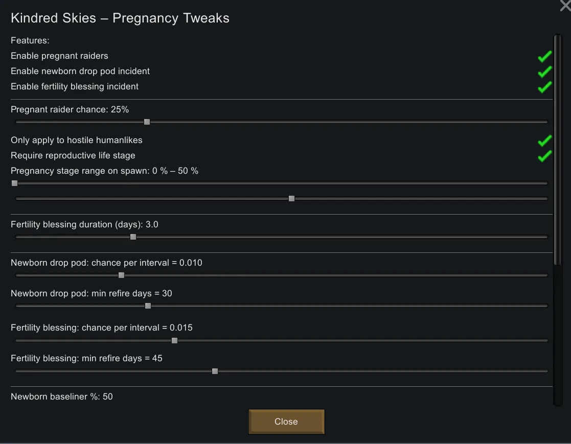 [*] Feature toggles: Pregnant raiders, Newborn drop pod, Fertility blessing