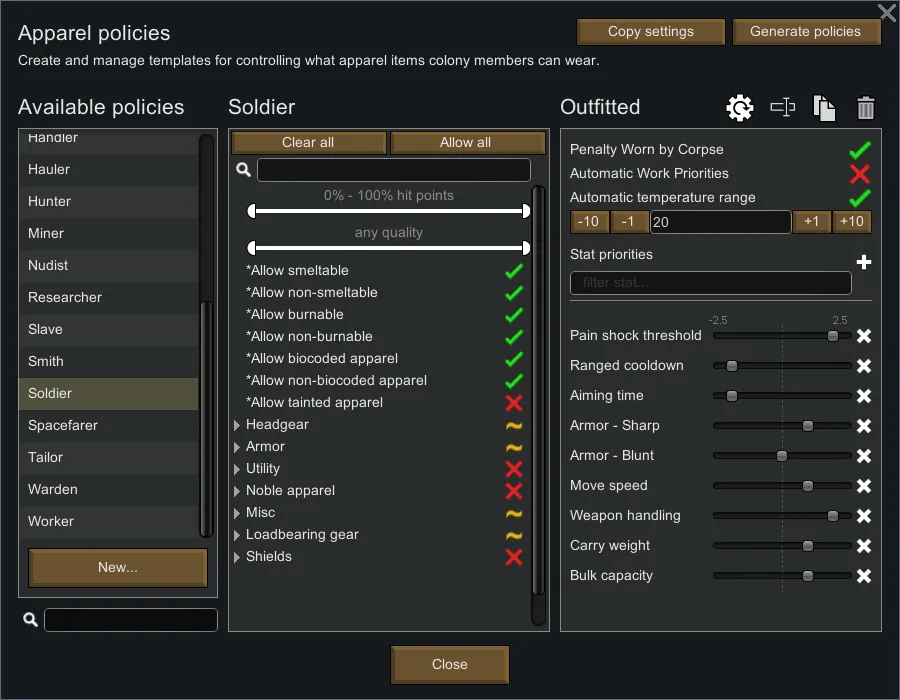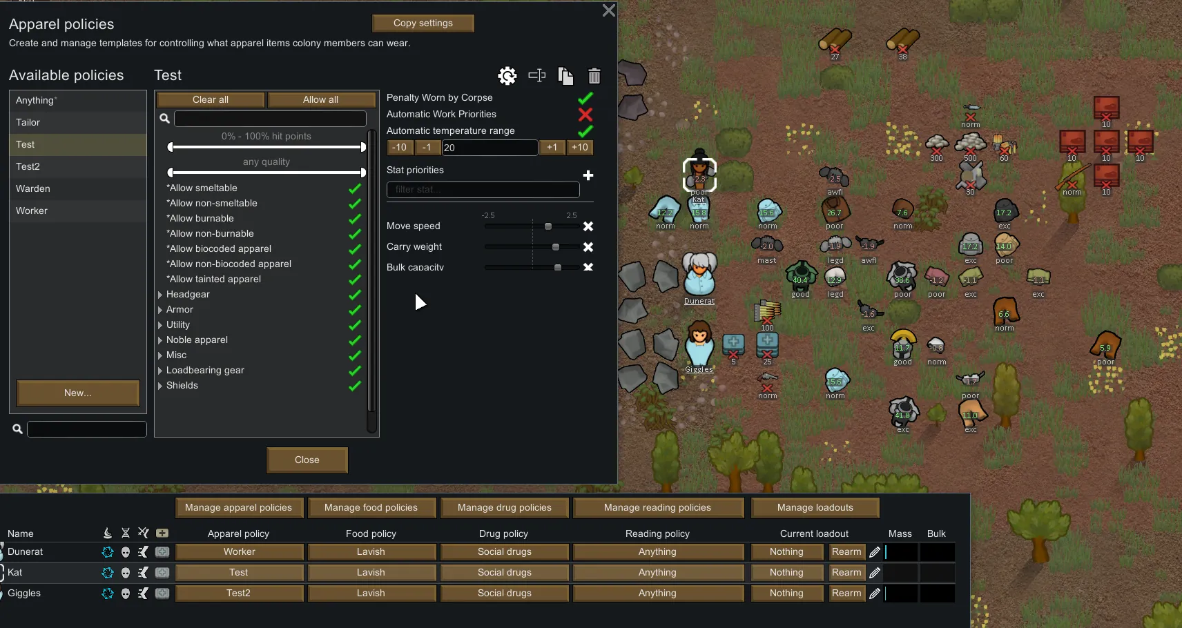 This is where the most important thing happens: you can allow to wear all possible apparels (okay, there are some exceptions, see below), then select the proper stat priorities for each policy/role and Pawns will adjust their apparels automatically based on score assigned by these priorities.