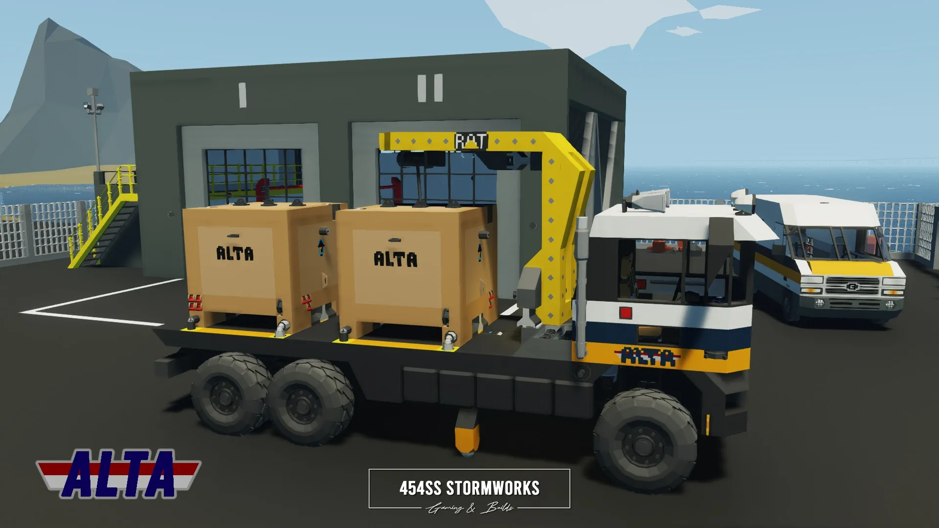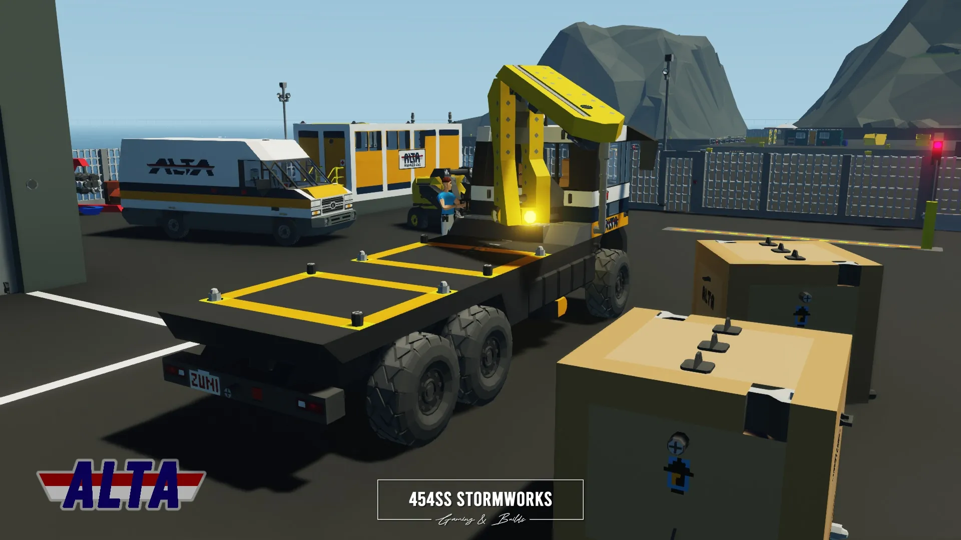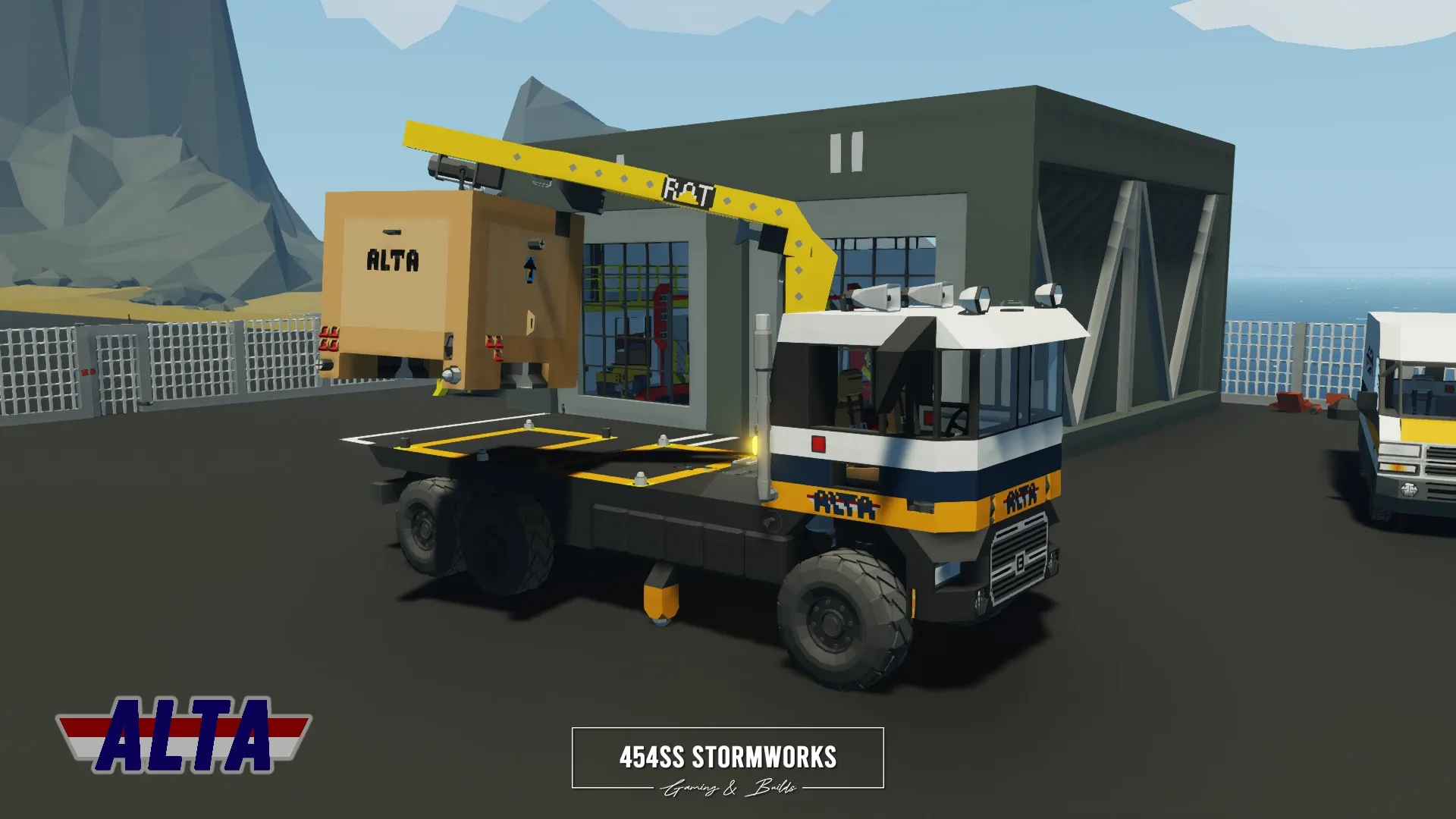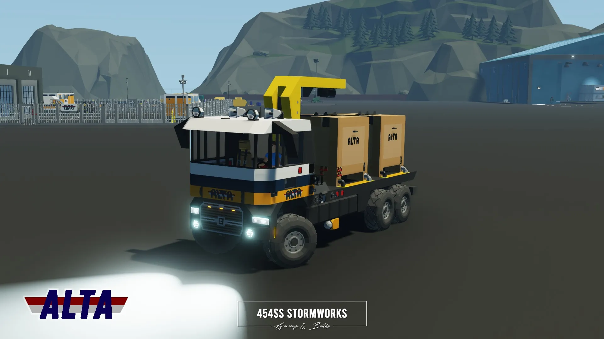 The Buckel Convoy is a Class 7 commercial-grade truck, produced since 2006 for the European market. This particular unit is owned by ALTA Industrial Corp., a (fictional) mining, drilling and transportation company. Under the cab is a supercharged 10 cylinder engine, attached to an oversized 1600 L fuel tank, towing-geared transmission and hexasteer rear axle. It features a UniCon crane, outriggers and a flatbed that allows easy loading and storage of two UniCon containers.