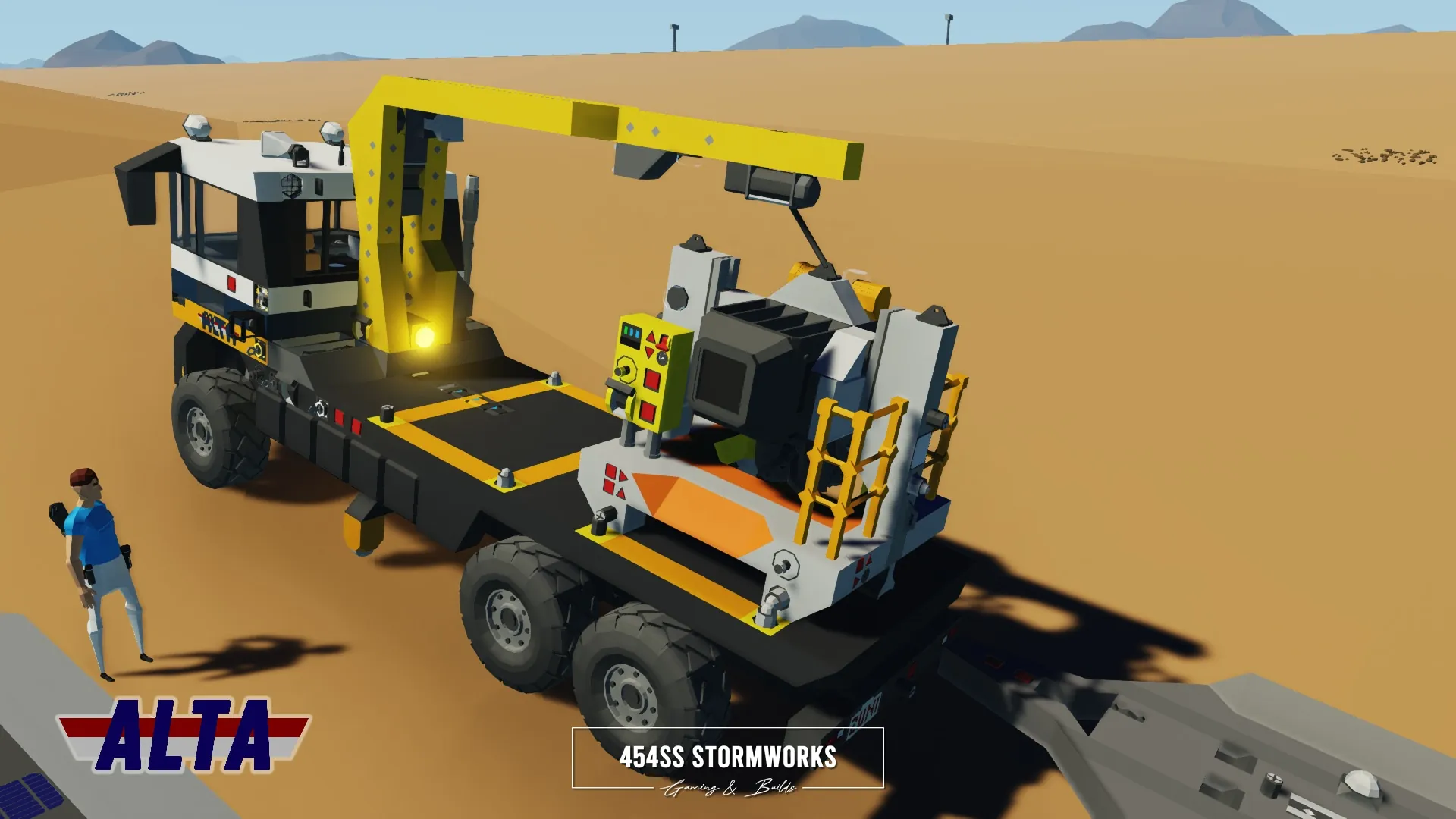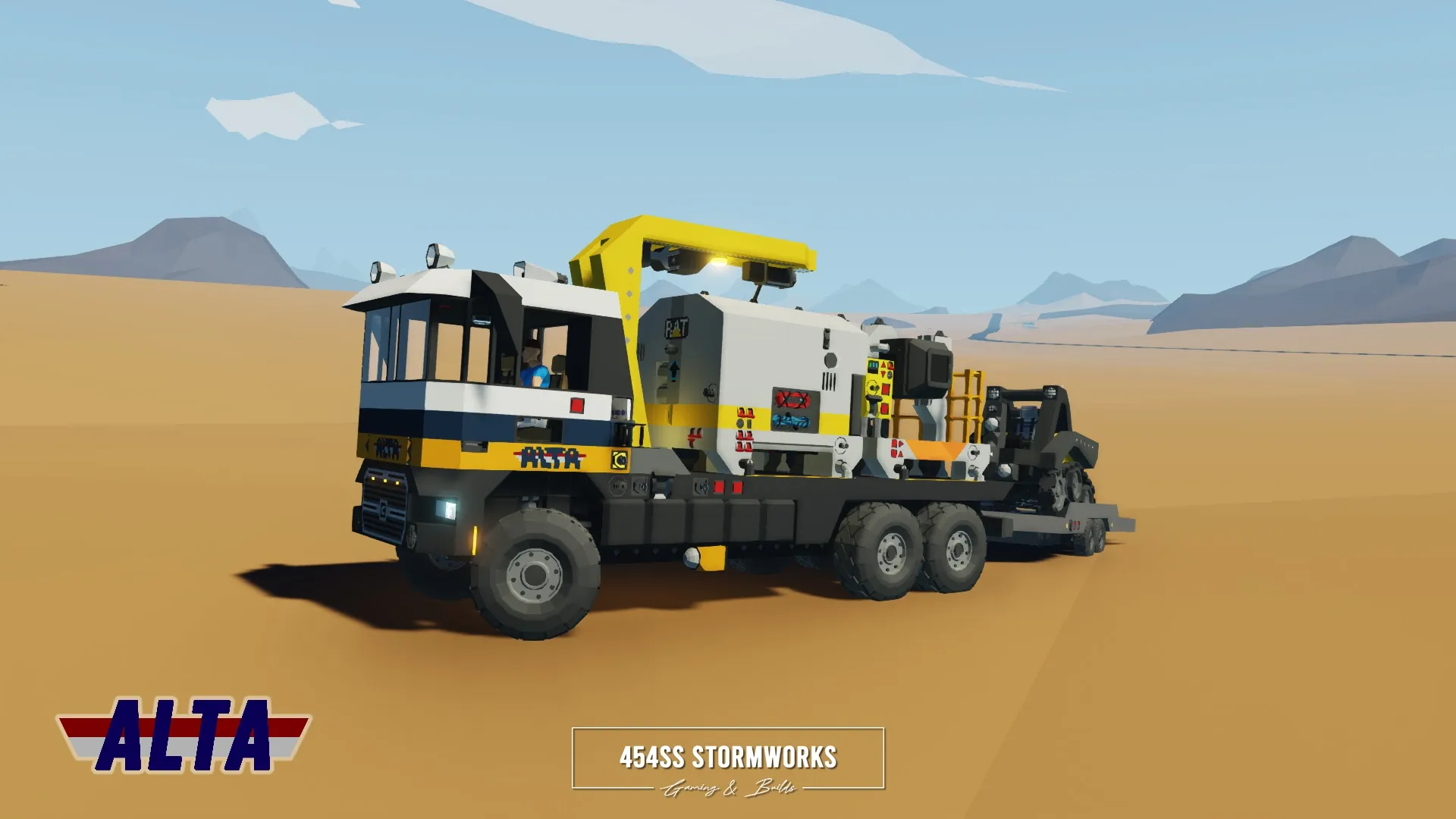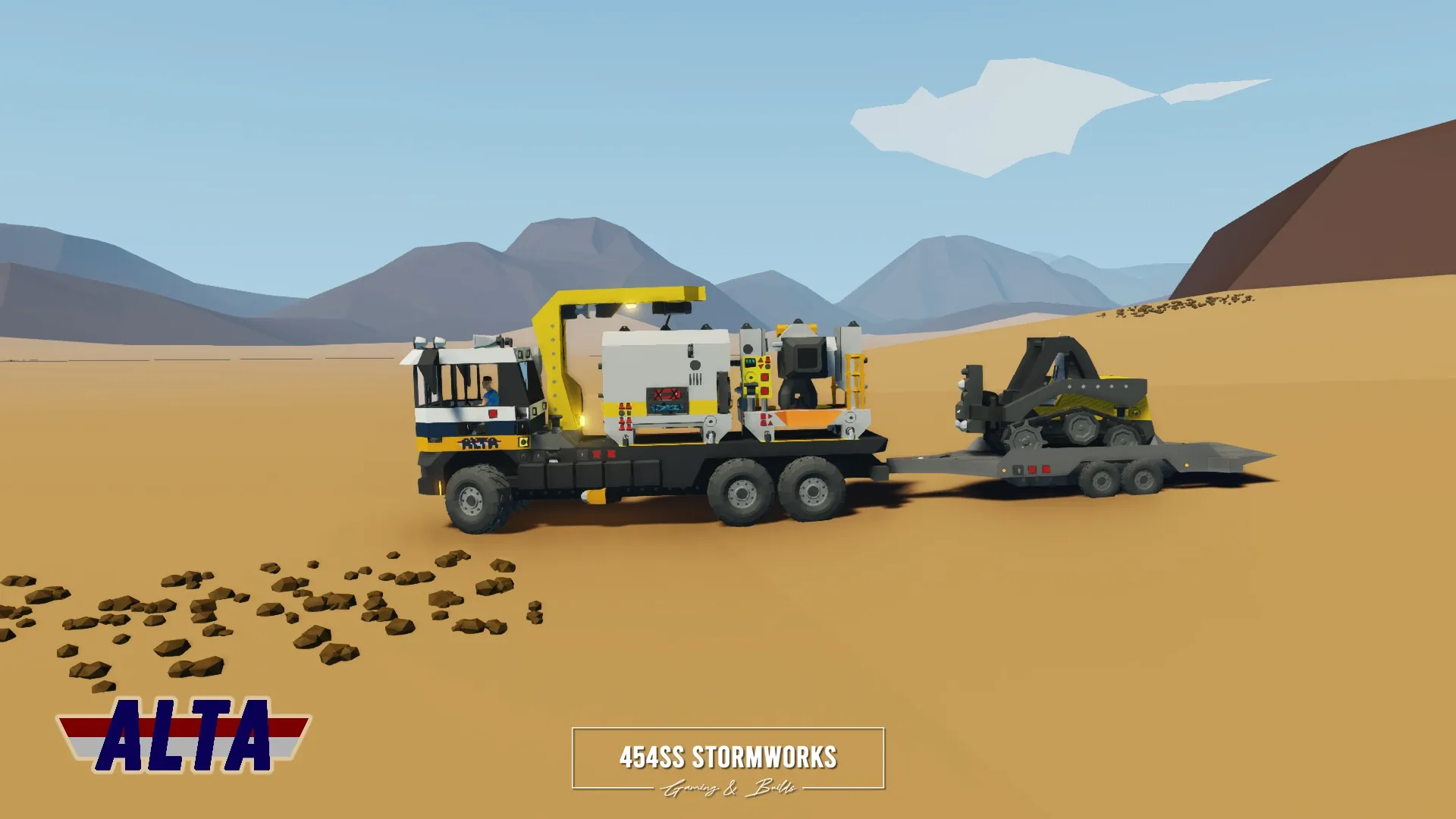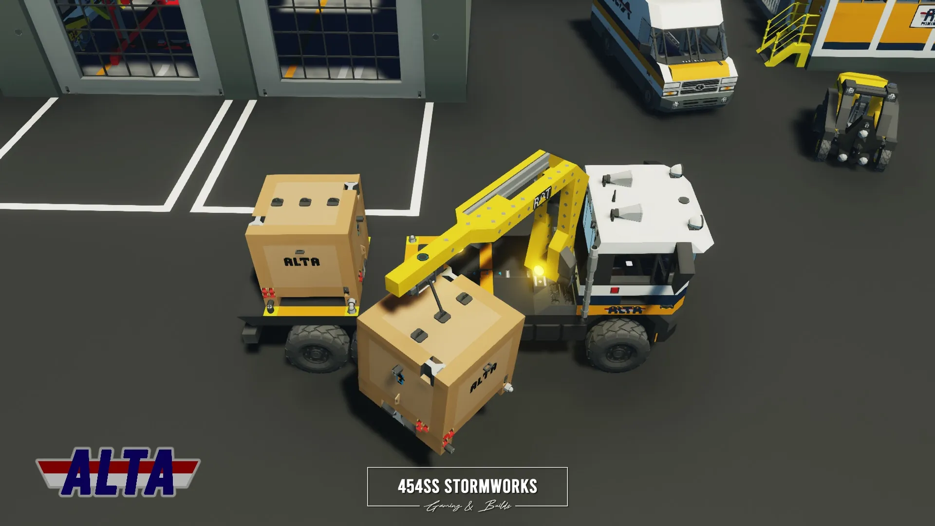 The Buckel Convoy is a Class 7 commercial-grade truck, produced since 2006 for the European market. This particular unit is owned by ALTA Industrial Corp., a (fictional) mining, drilling and transportation company. Under the cab is a supercharged 10 cylinder engine, attached to an oversized 1600 L fuel tank, towing-geared transmission and hexasteer rear axle. It features a UniCon crane, outriggers and a flatbed that allows easy loading and storage of two UniCon containers.