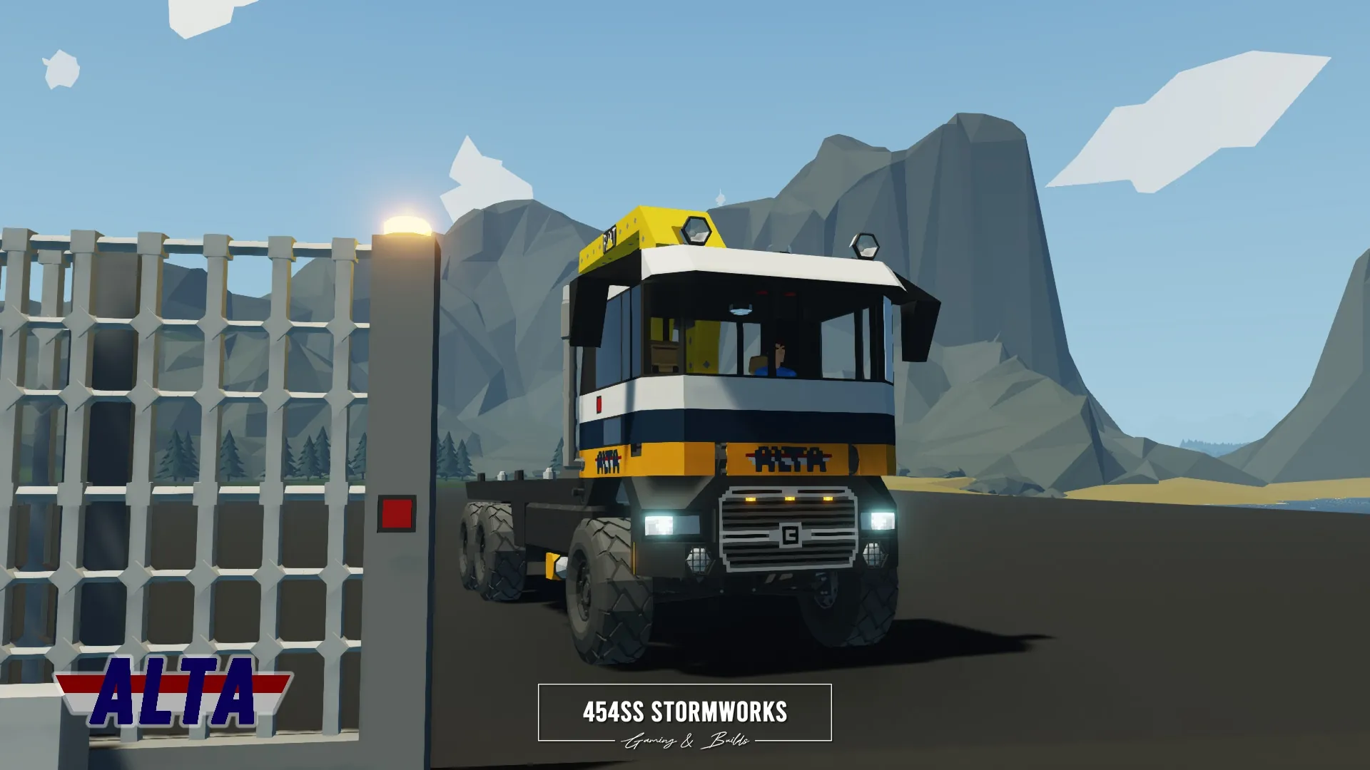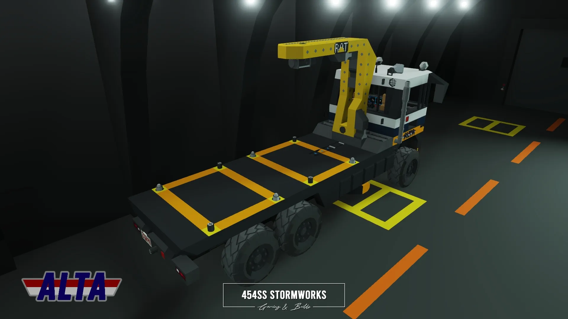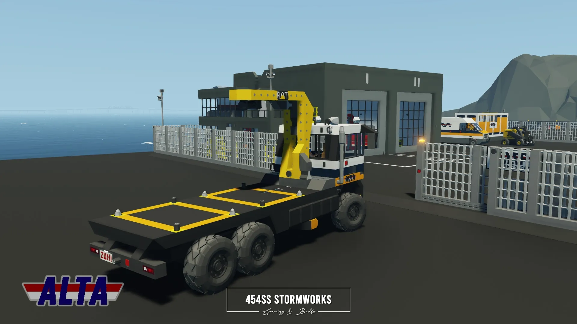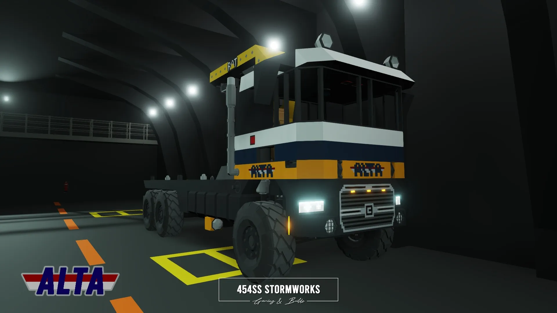 The Buckel Convoy is a Class 7 commercial-grade truck, produced since 2006 for the European market. This particular unit is owned by ALTA Industrial Corp., a (fictional) mining, drilling and transportation company. Under the cab is a supercharged 10 cylinder engine, attached to an oversized 1600 L fuel tank, towing-geared transmission and hexasteer rear axle. It features a UniCon crane, outriggers and a flatbed that allows easy loading and storage of two UniCon containers.