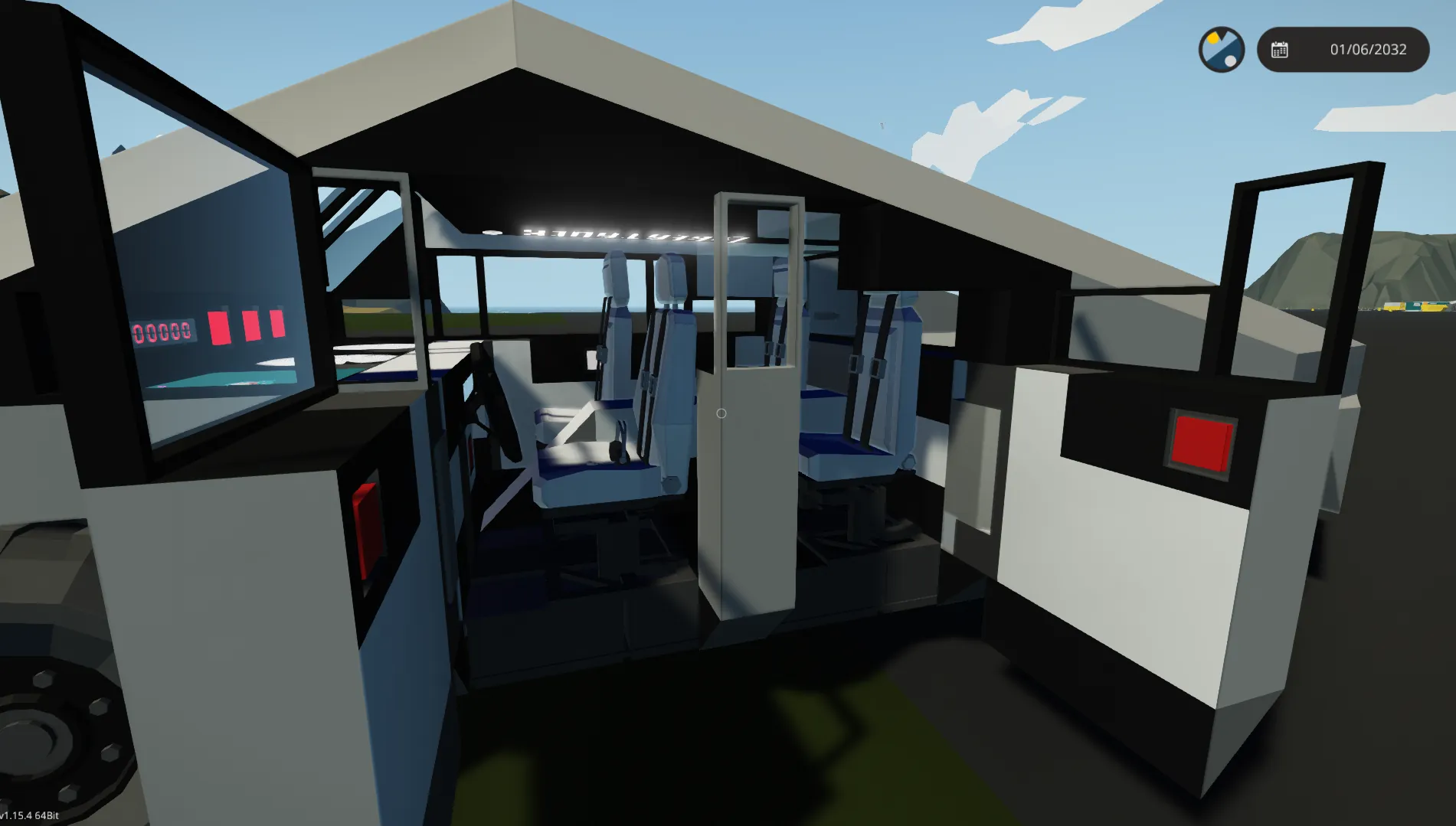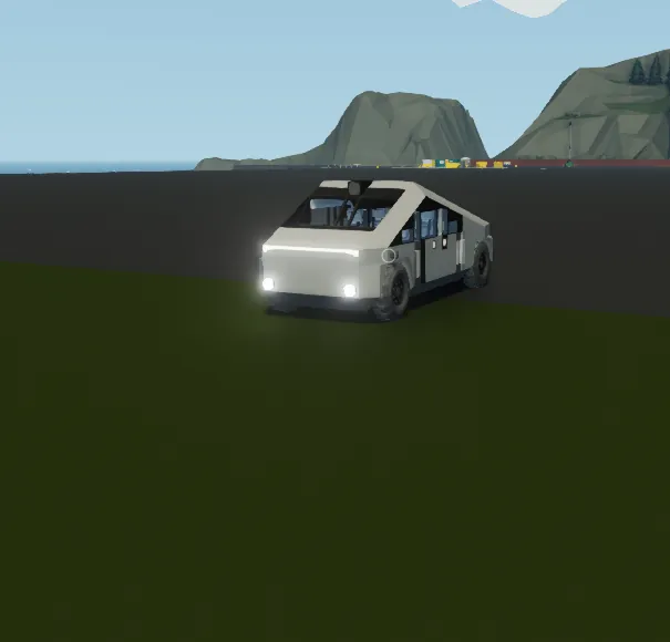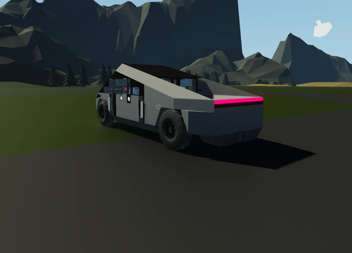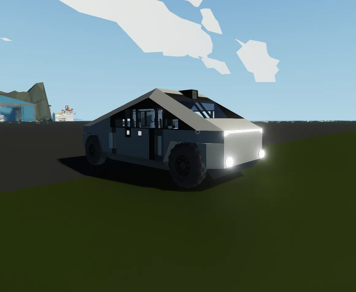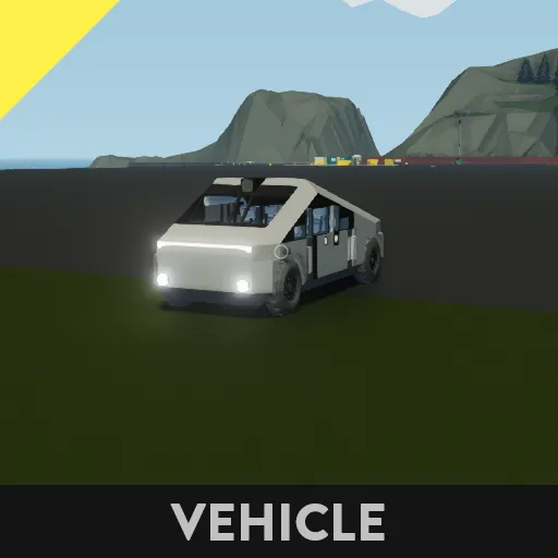 Modeled after Tesla Cybertruck. Lots of equipment in the back, 4 seats, electric engine, electric doors, plenty of decorative lights.