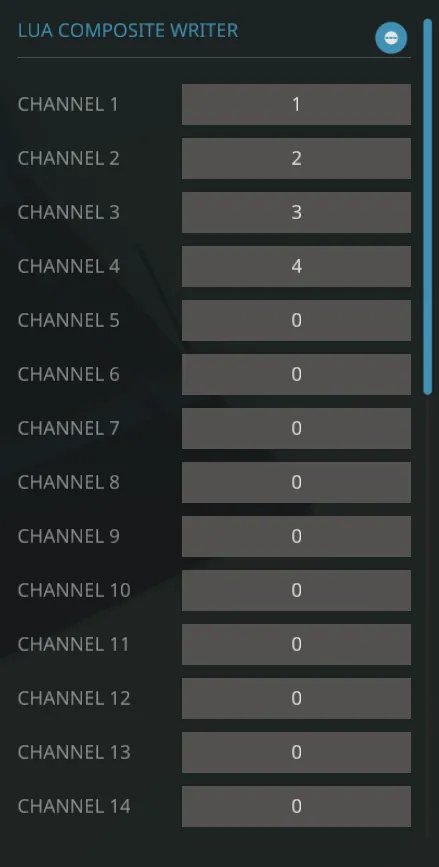 This is a Lua built writer to composite channels. Useful for spotlight pivots or the like. Static numbers based on property values.