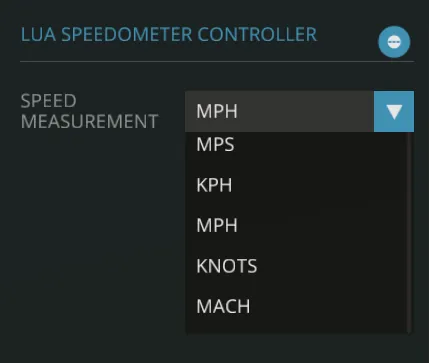 This is a Lua built speedometer controller. For now it just takes the speed from a speed sensor and converts it based on a property to either remaining meters per second (for testing), kilometers per hour, miles per hour, knots, or mach.