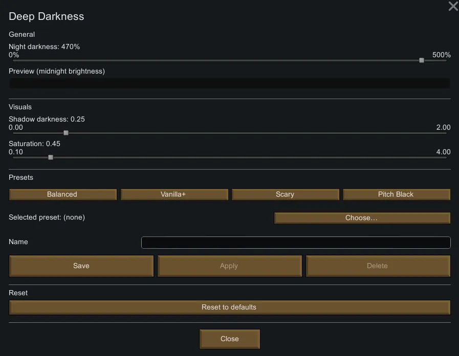 Lets you adjust how dark nights appear in RimWorld via a Mod Settings with night darkness, shadow darkness, saturation sliders.