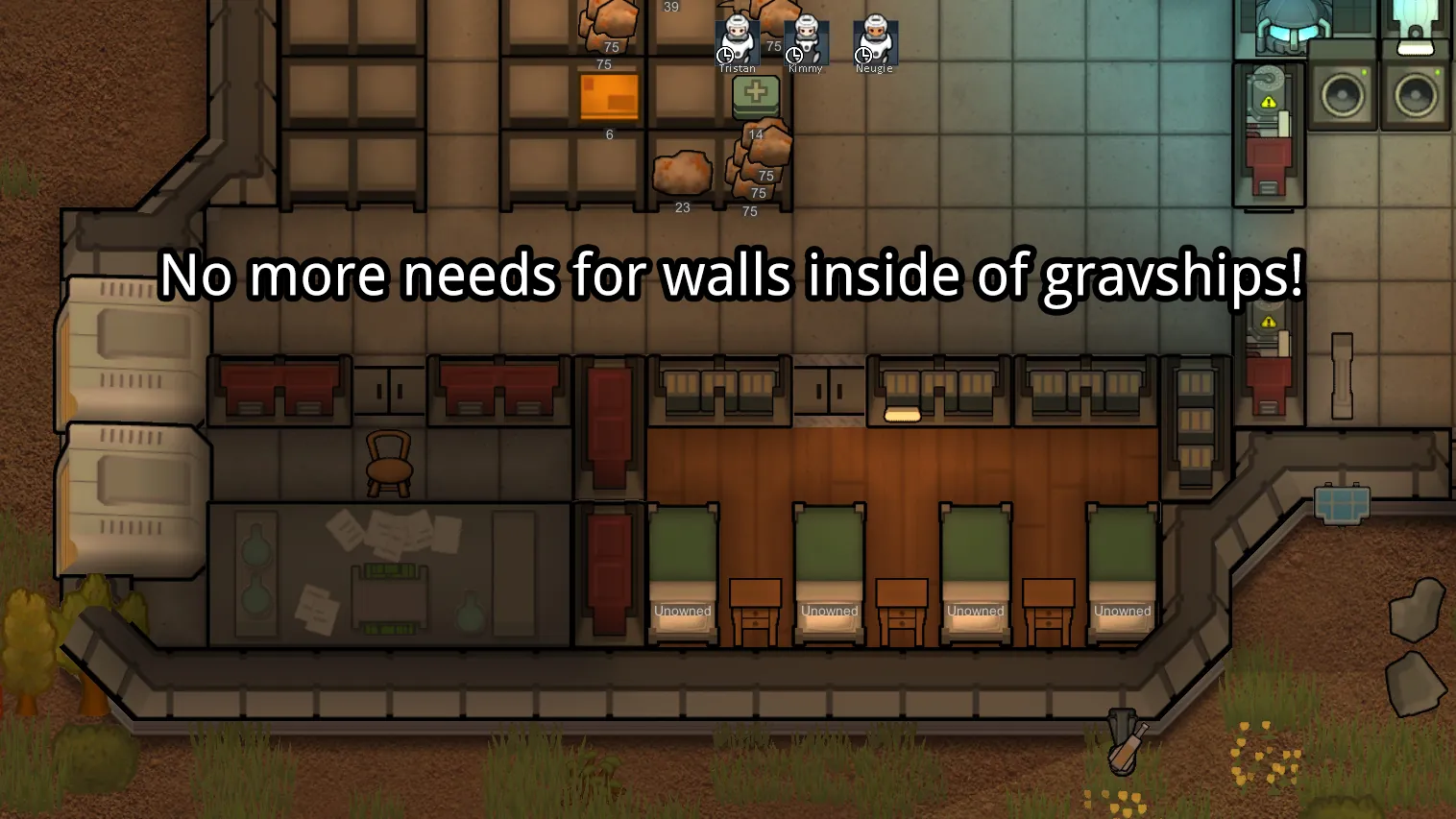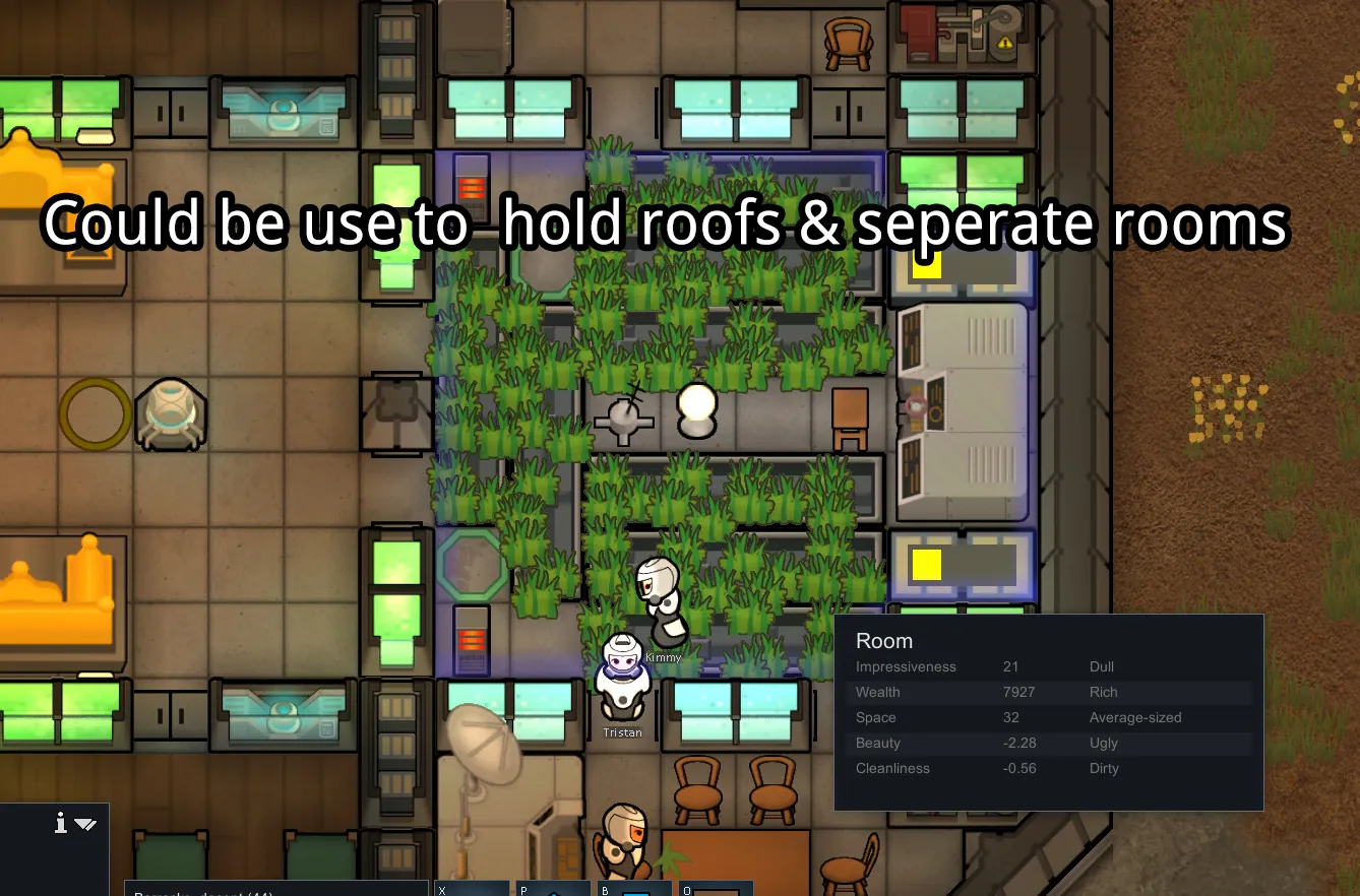 This Mod add about 10 kinds of 2x1 cells "Cabin Wall" buildings, those building are mostly replacement version of some original buildings. Also, all of the cabin walls could support with roofs and separate rooms, which means they could almost replaced the interior walls of a gravship.