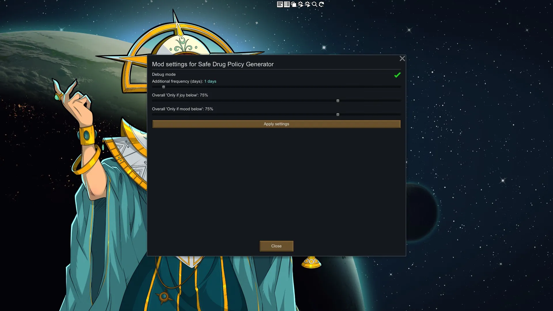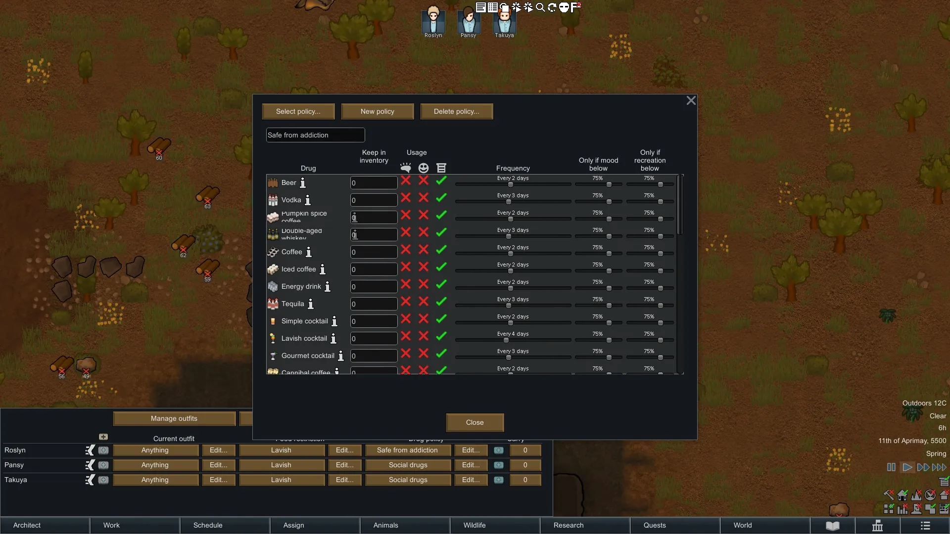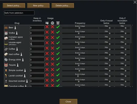 This mod automatically generates a drug policy that safe from addiction.