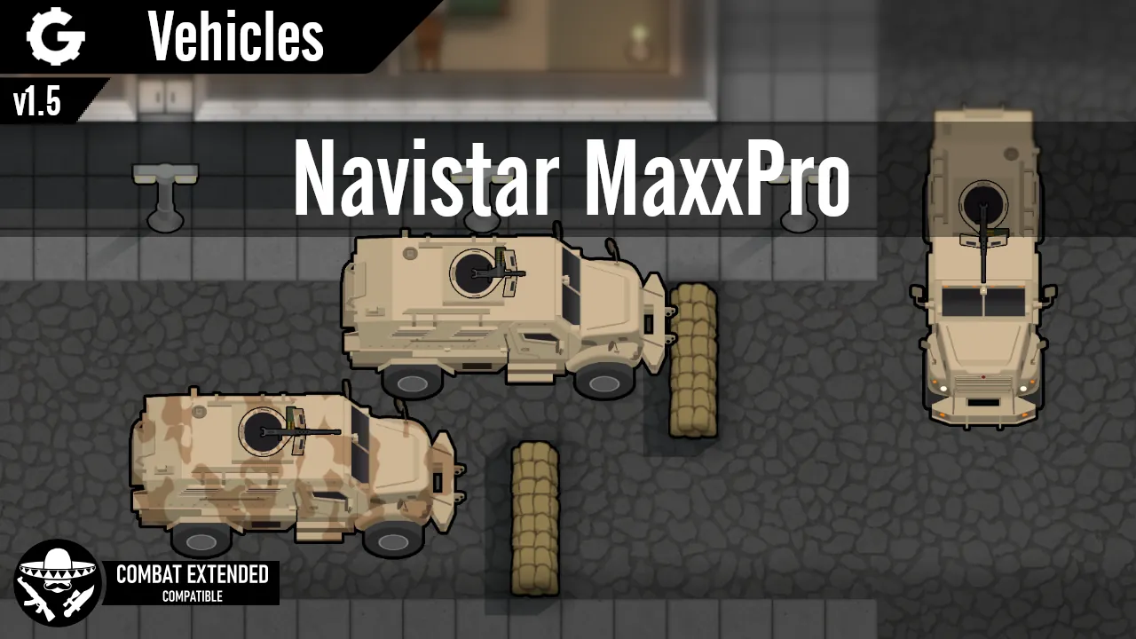The first in a series of vehicles I plan to add to Rimworld. Adds the MaxxPro, a massive armored truck designed to protect its crew against explosives and small arms fire. This particular model can be mounted with either a heavy machine gun or an automatic grenade launcher. Boasts a high carry capacity of 1000kg, but uses fuel at a very rapid rate.