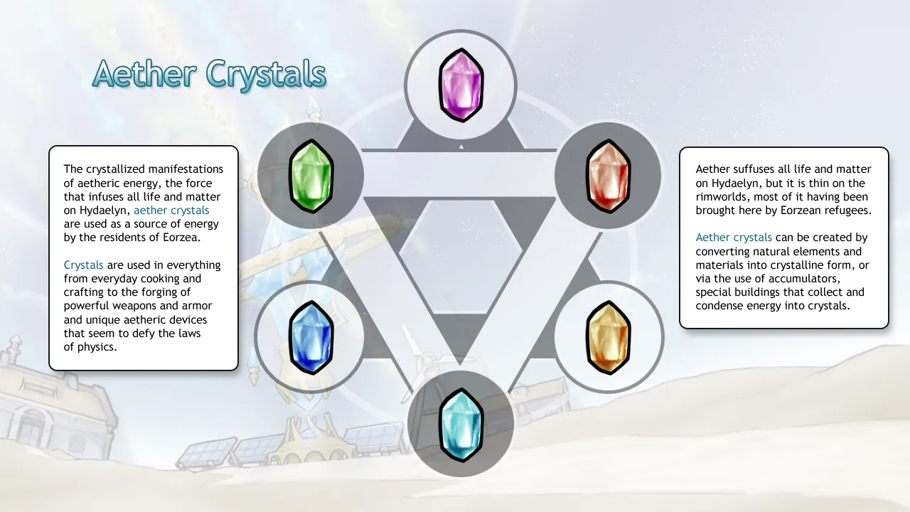 Master an alternative research tree based on aether, the magical essence of the world of Hydaelyn! Synthesize aether crystals for use in crafting, build accumulators to tap the natural energy of the rimworlds, and produce unique items!