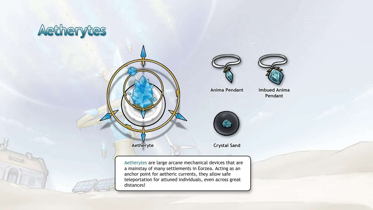 Build aetherytes and anima pendants that allow colonists to Return or Teleport to attuned aetherytes, even across the world! Quickly reinforce distant colonies or recall caravans!
