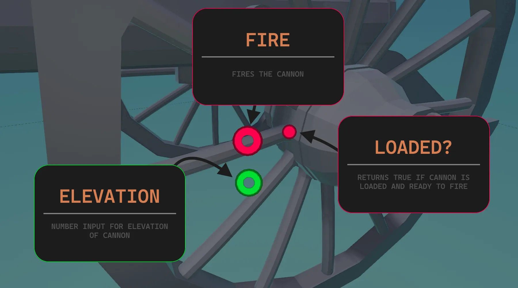 A number input may be connected to the cannon to adjust its pitch. An on/off can be connected to fire the cannon. The cannon outputs in an on/off node whether the cannon is loaded or not (returns true when loaded and ready to fire). The cannon can also be selected and named if desired.