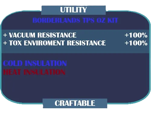 Adds Oz Kits from Borderlands: The Pre-Sequel. These utility slot items provide protection from extreme temperatures and hazardous atmospheric conditions.